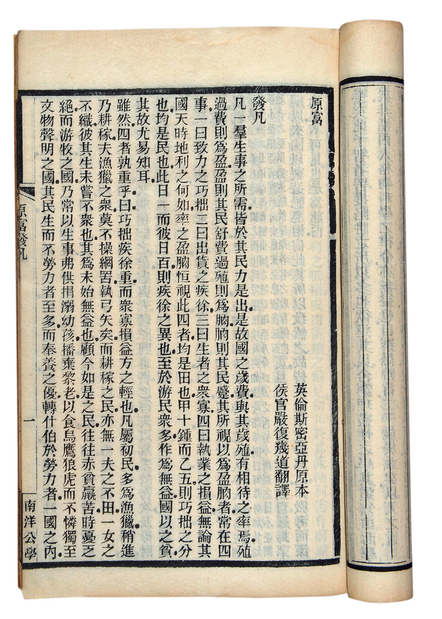 斯密亚丹原富五集:光绪二十八年南洋公学刊本,凡例称:“凡一群生事之所需,皆於其民力所出”。