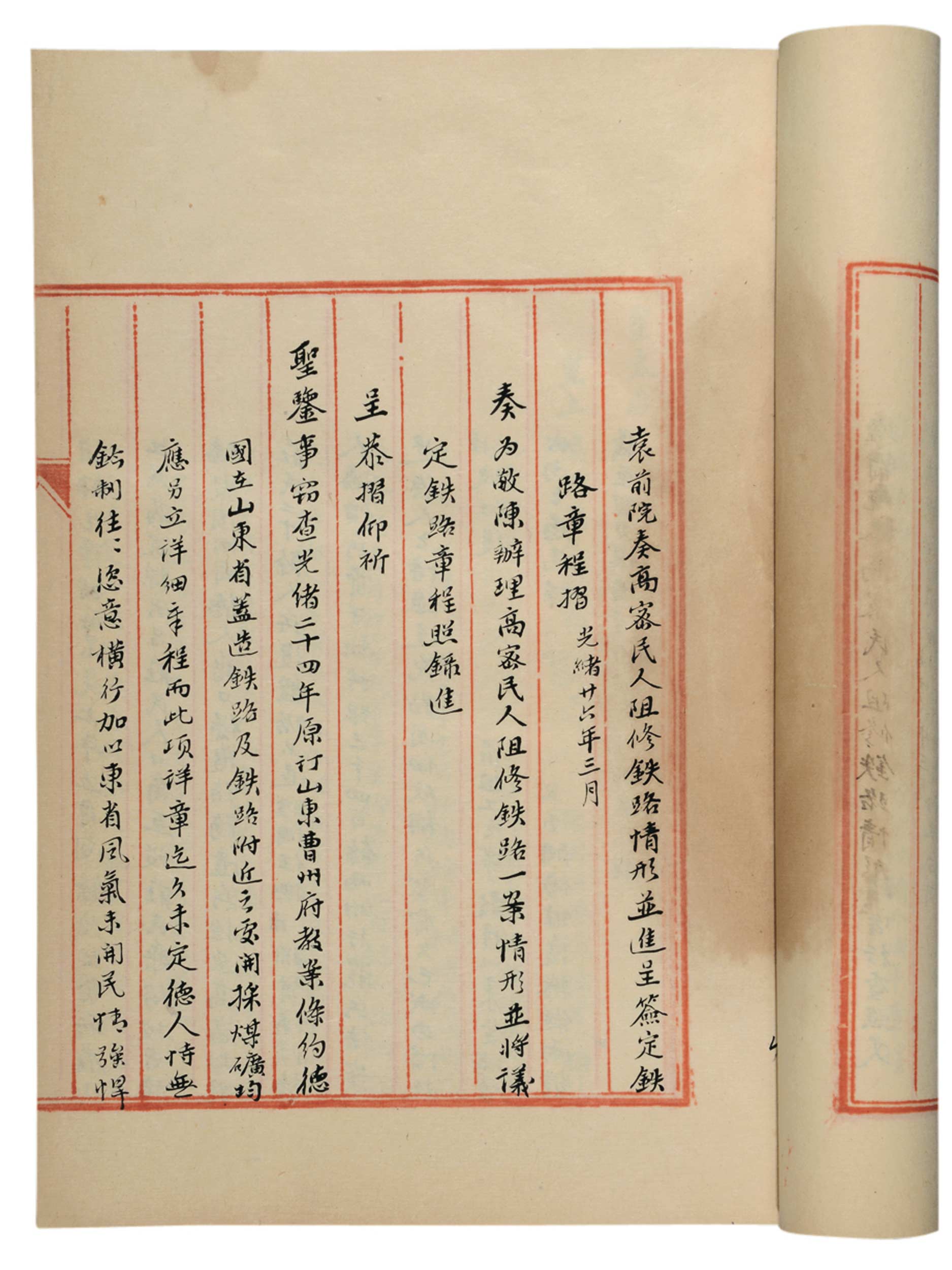 袁世凯奏高密民人阻修铁路情形并进呈签定铁路章程摺(选自修建胶济铁路档案,山东省长沈铭昌手稿本)