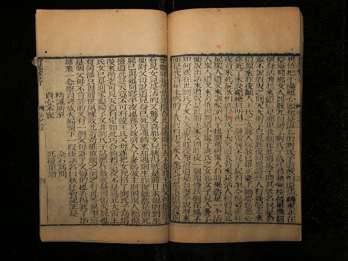 书长18.4×11.6cm,半框12.8×9.9cm,12行25字,四周单边,黑口单黑鱼。版心上题书名,中记卷目,下记叶数。竹纸细字,刻印于小说中尚称精整。小虫损,整体清爽。