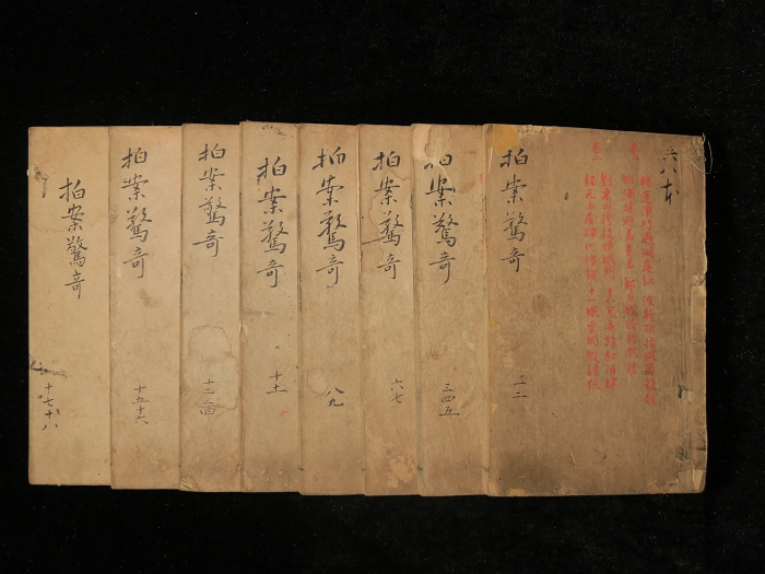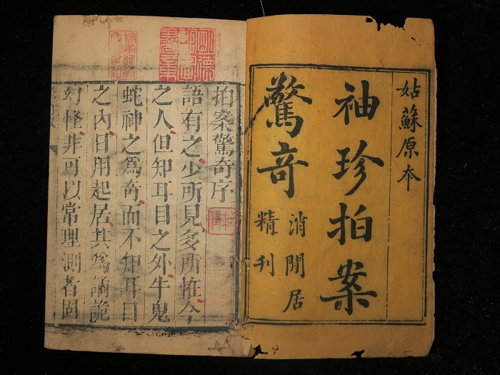 拍案惊奇十八卷:8册一函全,不提撰人(凌濛初辑),道光间消闲居刊。书名页题“姑苏原本袖珍拍案惊奇 消闲居精刊”。前有拍案惊奇序,目录,藏印四:明德馆图书章、摉(捜)轩进藤氏藏书记、听莺斋、和堂。