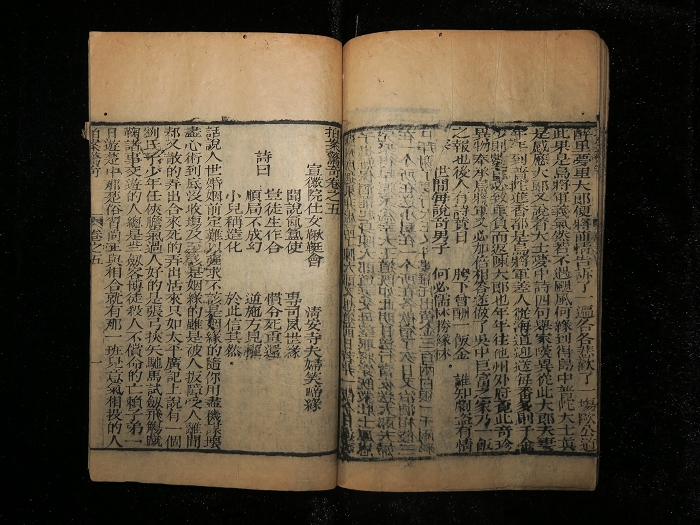 书长18.4×11.6cm,半框12.8×9.9cm,12行25字,四周单边,黑口单黑鱼。版心上题书名,中记卷目,下记叶数。竹纸细字,刻印于小说中尚称精整。小虫损,整体清爽。