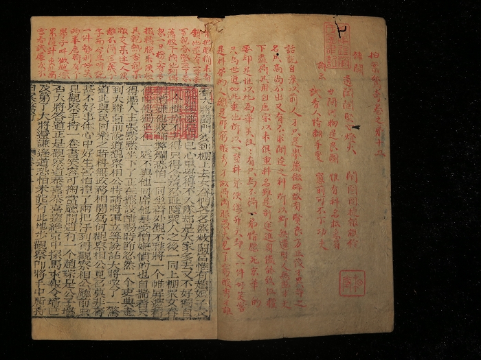 每册封面有朱笔手书回目,正文天头有主笔校正,卷十一天头通篇朱笔“补阙”,当为听莺斋进藤氏手迹。明德馆为秋田藩校,宽政元(1789)年藩主佐竹义和设立,馆内硕学有村濑栲亭、山本北山两大汉学重镇,汉学、算术、中医等学问皆为当时权威,明治年间废立。