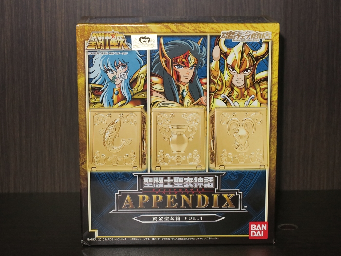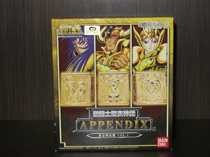 魂NATION2008年展首次出现的黄金圣衣箱,相信令许多玩友眼前一亮。等待一年之后,万代以魂商店限定的形式,分别于2009年11月至2010年6月,先后四次作为圣衣神话Appendix系列发售了四款圣衣箱套装,每款三只,其中VOL.1和VOL.3分别附赠老年童虎和贵鬼的PVC人偶。