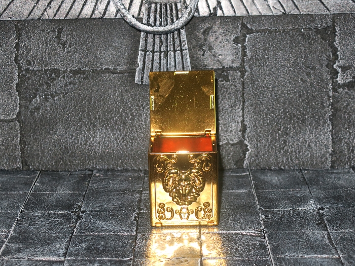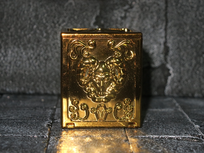官方正版的圣衣箱材质为合金,重量感十足。连接处缝隙处理精细,不易看出。圣衣箱可四面打开,可装置万代正版的星座形态圣衣(另行购买);星座图案的浮雕非常精美,甚至连花纹也栩栩如生。