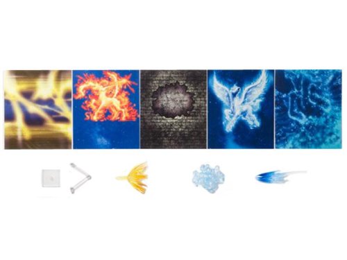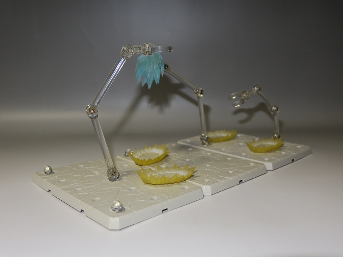 套装内容:台座×3、台座接续零件×4、素体用长支柱×3、素体用短支柱×3、必杀技特效用延长支柱×3、必杀技特效用延长支柱(短)×3、素体腰部固件(大)×3、素体腰部固件(小)×3、素体腿部固件×6、背景纸固件等
