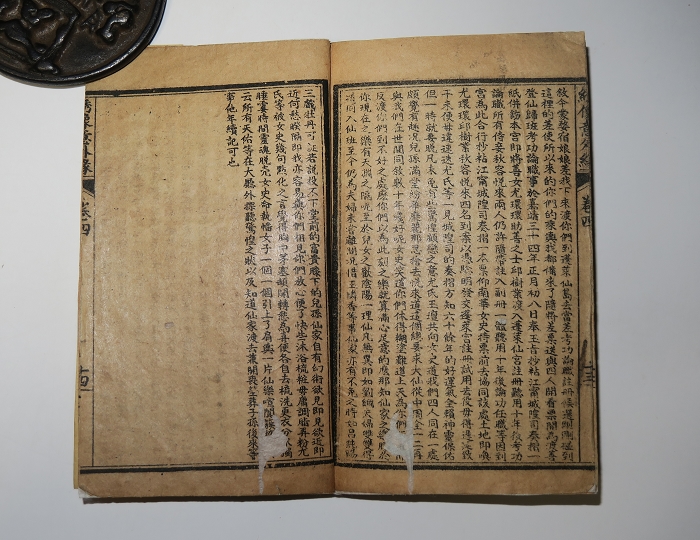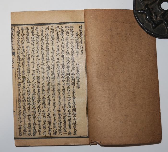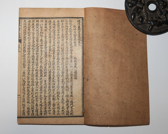 书长13.2×8.2cm,半框10.9×7cm,14行34字,四周双边,白口单黑鱼。版心上题“绣像意外缘”,内记卷目,叶数。有光纸,印刷清晰,阅读容易。4册合计80叶160面,连函厚约2.2厘米,首册前数叶小修补,余品好。