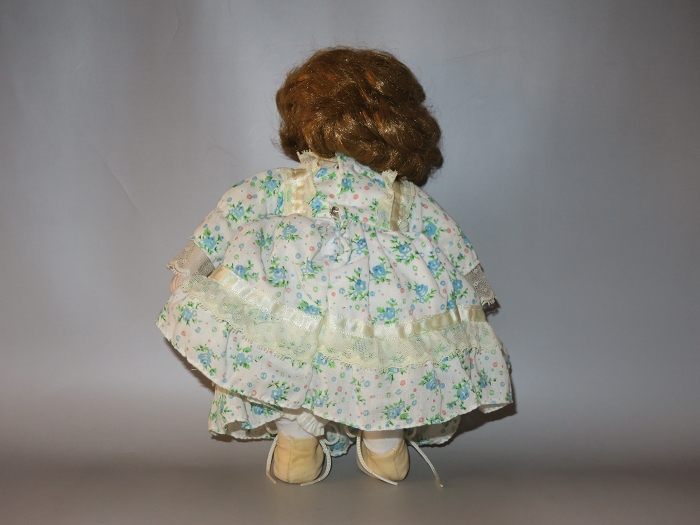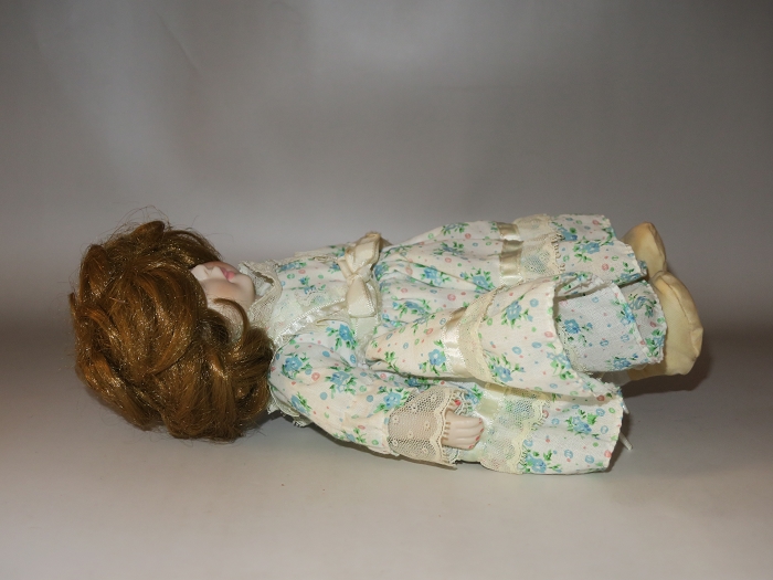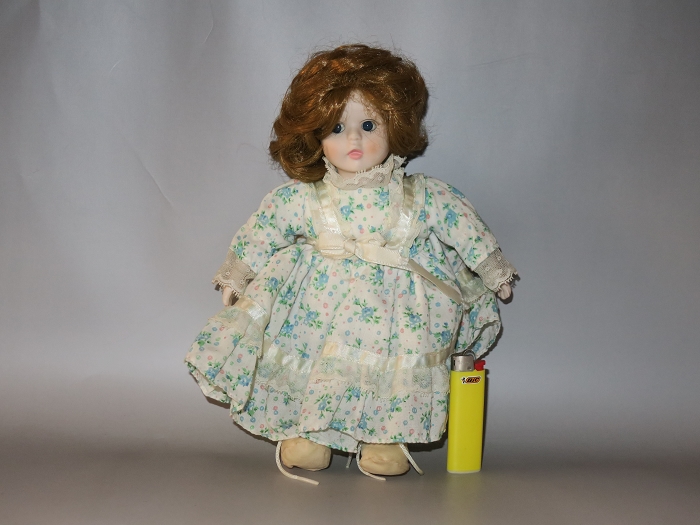 original doll collection. She is porcelain and 10.5 inches tall with all clothing accessories. The identification tag inside of dress states “Rolinis Inv. Co, Ltd.” She is in good condition, a little dusty, and slight staining starting to occur on edge of shoes.