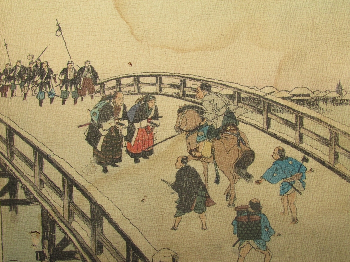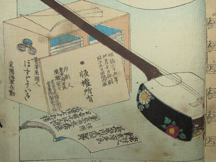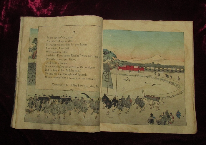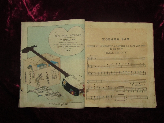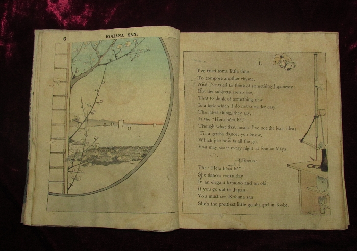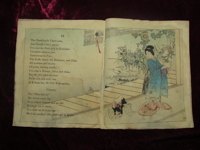 楽譜のページが終わると、6番まである歌の歌詞のページとなり、そのそれぞれに、歌詞に即した挿絵が入れられる。著者のF.M.Bostwickが歌の中でKohana sanと呼ぶ芸者が実在の人物がどうかはわからないが、小花さんの父が大名であっただとか、赤穂浪士四十七士の血筋であったと歌い、外国人好みの大名行列や四十七士の挿絵を入れているのがどこか作為めいて感じられる。