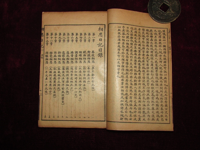 书长15.5×10.3cm,半框12.6×8.2cm,14行28字,四周单边,下黑口无鱼。版心上题“相思日记”,内记章目,叶数。有光纸,软体,印刷清晰。56叶112面,品较好。