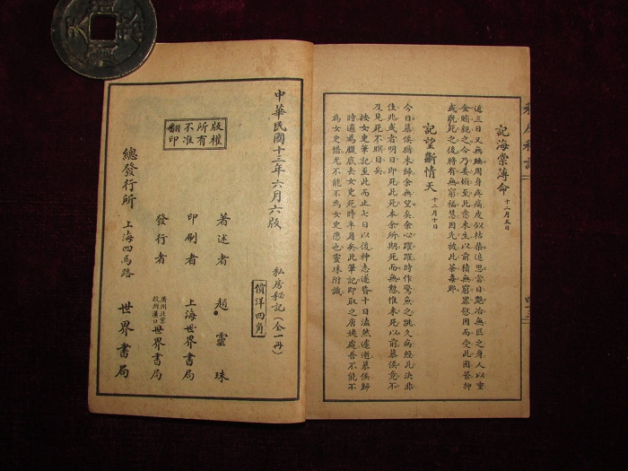 4)现身说法私房秘记:一册全,赵灵珠著,上海世界书局石印本,版权页题中华民国十三年六月六版,价洋四角。前有序;私房秘记目录。内收记情海翻波以下50则,日记体,起元宵,终十二月七日,文言。