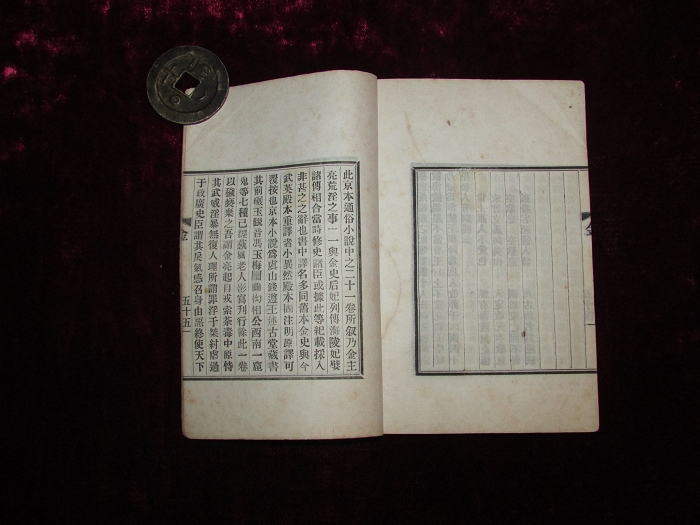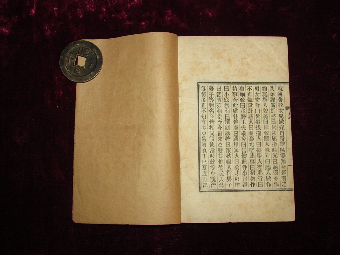 书长18.9×13.1cm,半框10.9×9.7cm,11行18字,有界,四周双边,白口单黑鱼,版心内题“金”,叶数。绵连纸,金属铸造字,排印偶有歪斜,别有一番美感。56叶112面,品好。