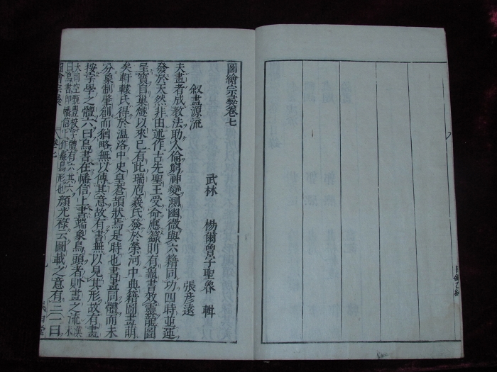 此为明代版画名著,千顷堂书目著录,但不著编撰者姓名。原刻为万历三十五年夷白堂刊本。又有万历间金陵文林阁刊本,卷首序末亦署“新安蔡冲寰汝佐绘,玉林黄德宠镌”。每卷前载画论,后以图示。所载图画极精,颇生动,书中论画之作,皆係採录宋元以来前贤著述而成。其人物翎毛、梅花竹兰等卷,大抵据周履靖编《夷门广牍·画薮》五种增润而成。卷一人物山水四十二图;卷二梅花八十七图;)卷三翎毛花卉(草虫附五十六图;梅谱卷四竹谱收六十三图;卷五兰谱(草出附)三十六图;卷六兽畜虫鱼(花草附、文房器皿附)四十九图;卷七敘画源流、论制作规模、画训、画意、画题、画格、拾遗、论画、画记,无图。