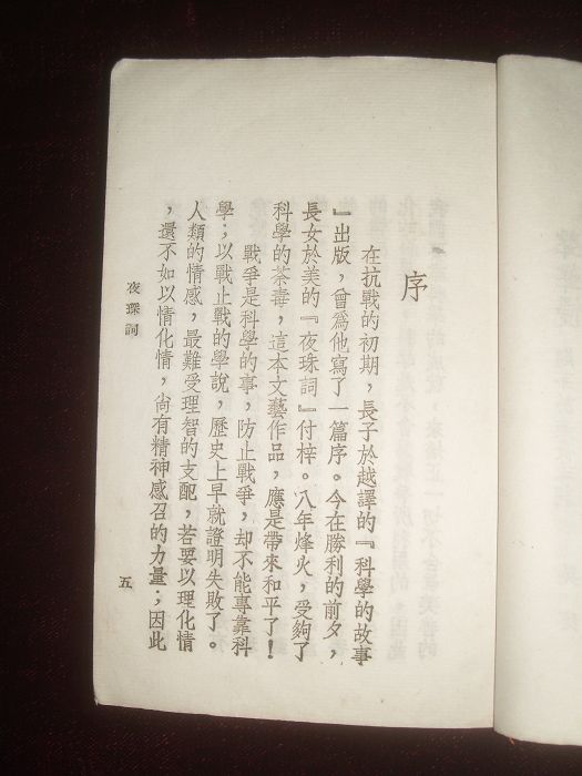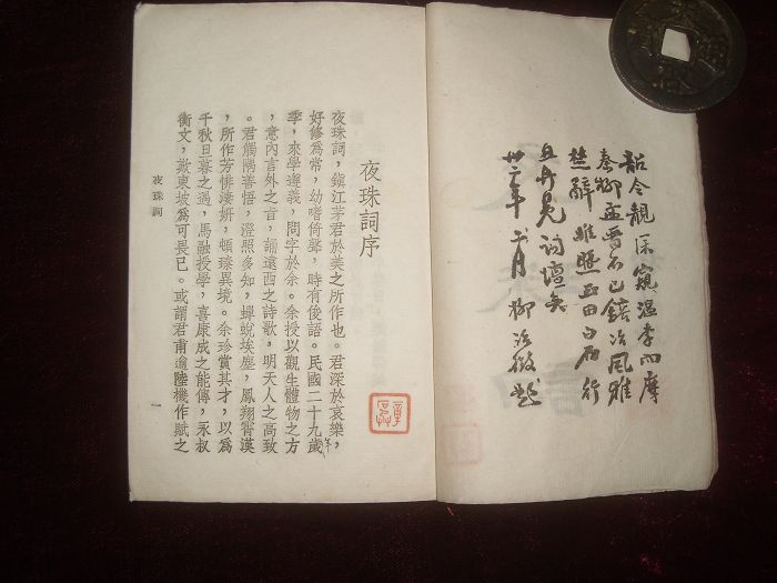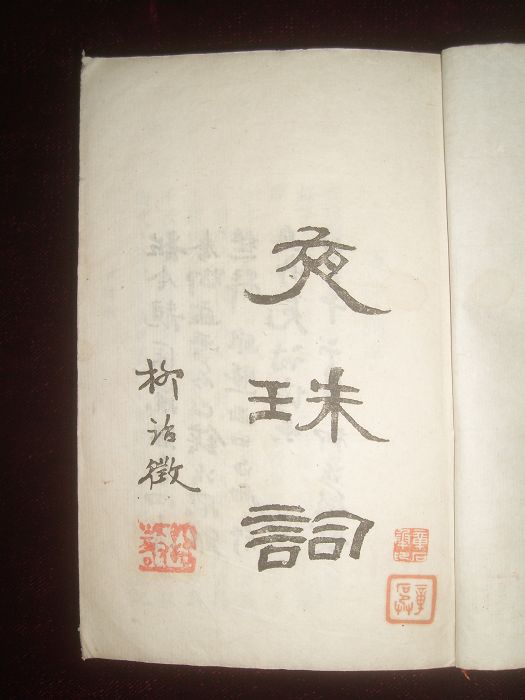 夜珠词:一册全,茅於美著,民国三十四年序刊,石版朱墨套印本,封面题字柳诒徵。前有卅二年二月柳诒徵题词;中华民国三十一年春日溧阳缪钺夜珠词序;吴宓声声慢题茅於美夜珠词;民国三十三年冬茅於美自序于昆明清华研究院。钤印二:章石承印、章石承。