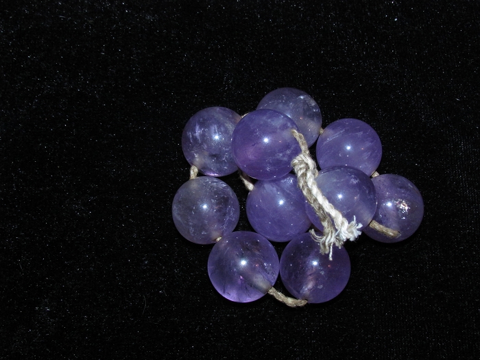 紫水晶(amethyst):水晶的紫罗兰色变体,半珍贵宝石,二月的传统诞生石。名称来自于古希腊语的 ἀ a- (「不」)和 μέθυστος methustos(「醉」),在古希腊文化中,紫水晶被认为是酒神的象征,佩戴紫水晶可使主人避免喝醉。