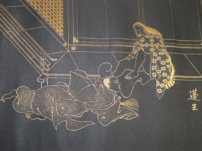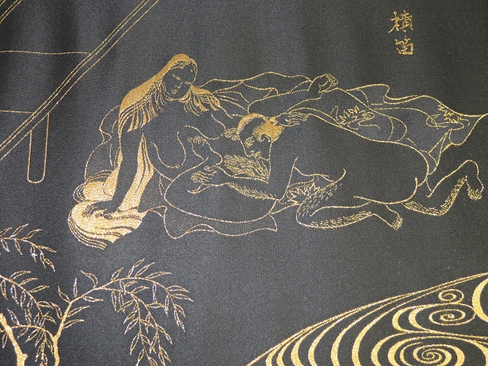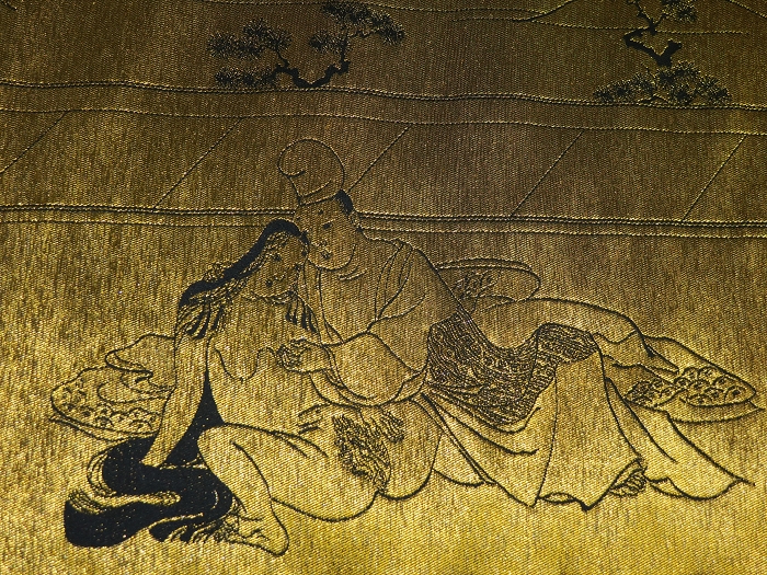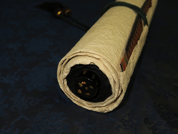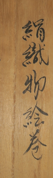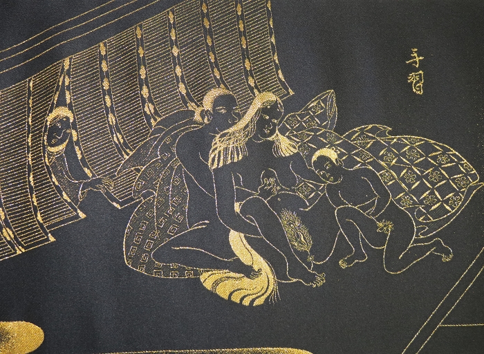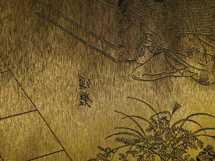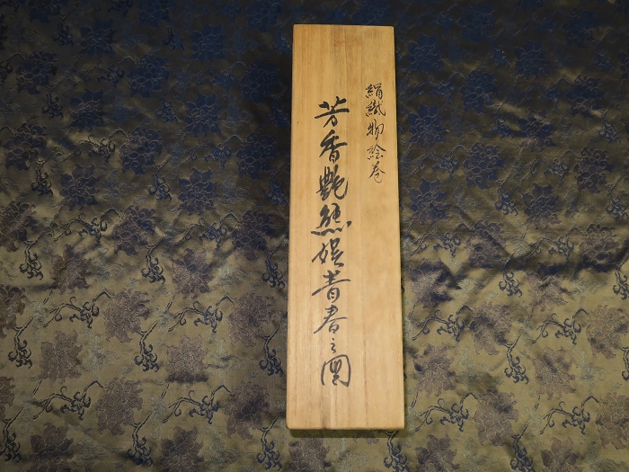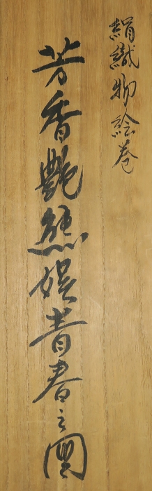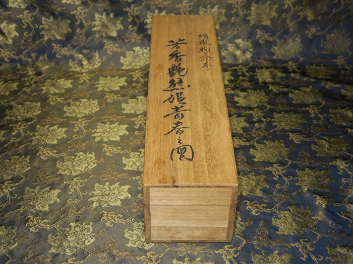 金襴絹織物絵巻,木製黒漆軸,螺鈿象嵌、共箱入り。墨書銘“芳香艶態娯靑春、娱怡然有余乐、正悦(うぶ荷)”。