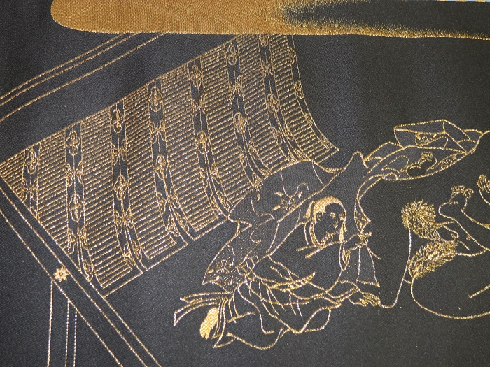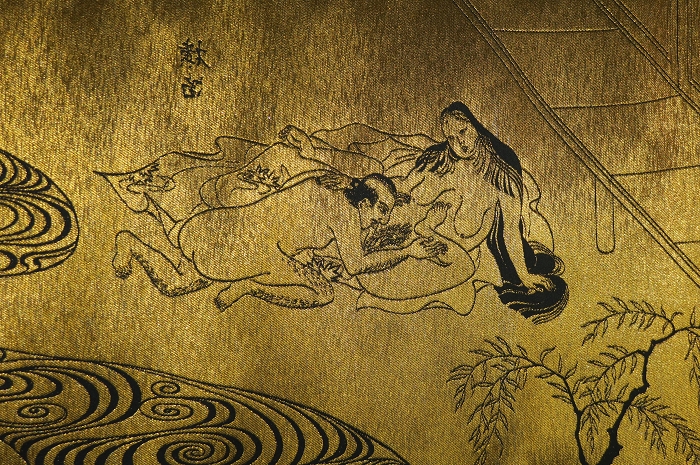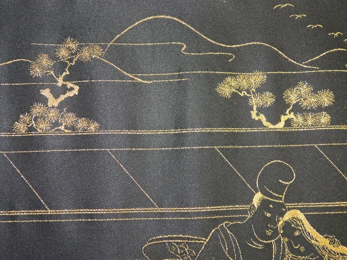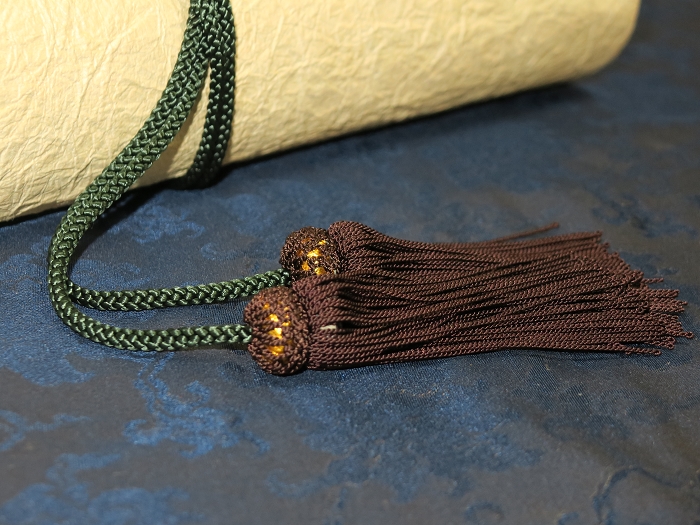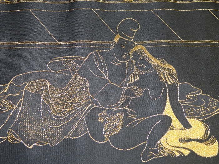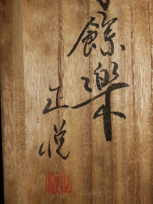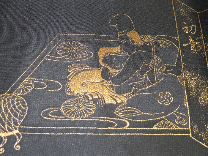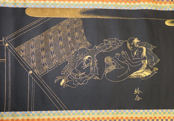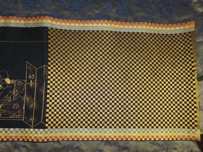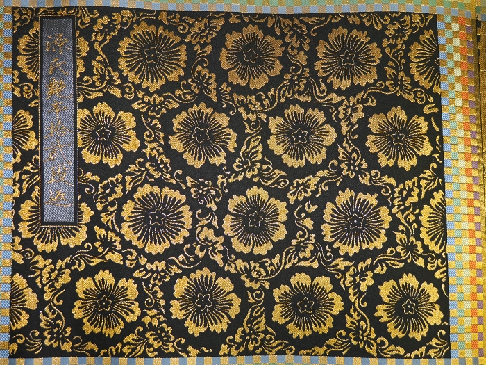 金襴絹織物絵巻,木製黒漆軸,螺鈿象嵌、共箱入り。墨書銘“芳香艶態娯靑春、娱怡然有余乐、正悦(うぶ荷)”。