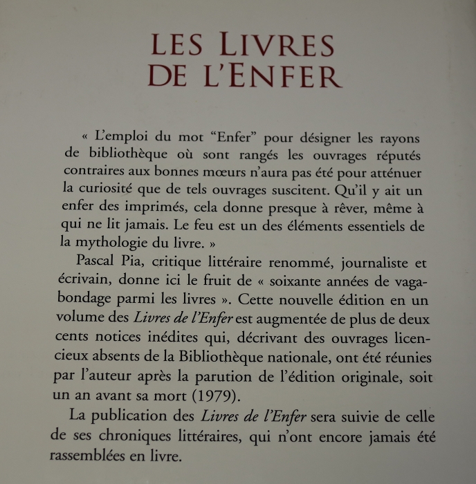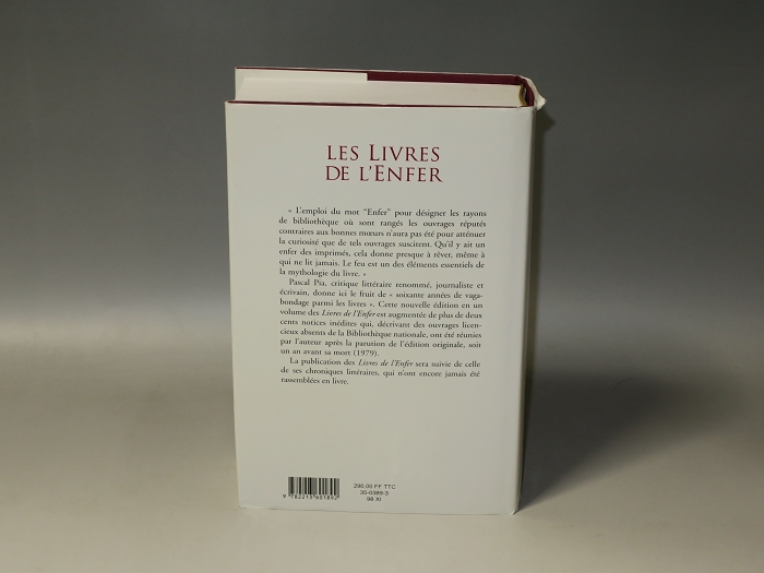 Cette nouvelle édition en un volume des Livres de l’Enfer est augmentée de plus de deux cents noticés inédites qui, décrivant des ouvrages licencieux absents de la Bibliothèque nationale, ont été réunies par l’auteur après la parution de l’édition originale, soit un an avant sa mort (1979). La publication des Livres de l’Enfer sera suivie de celle de ses chroniques littéraires, qui n’ont encore jamais été rassemblées en livre.” Fine in Fine dustwrapper.
