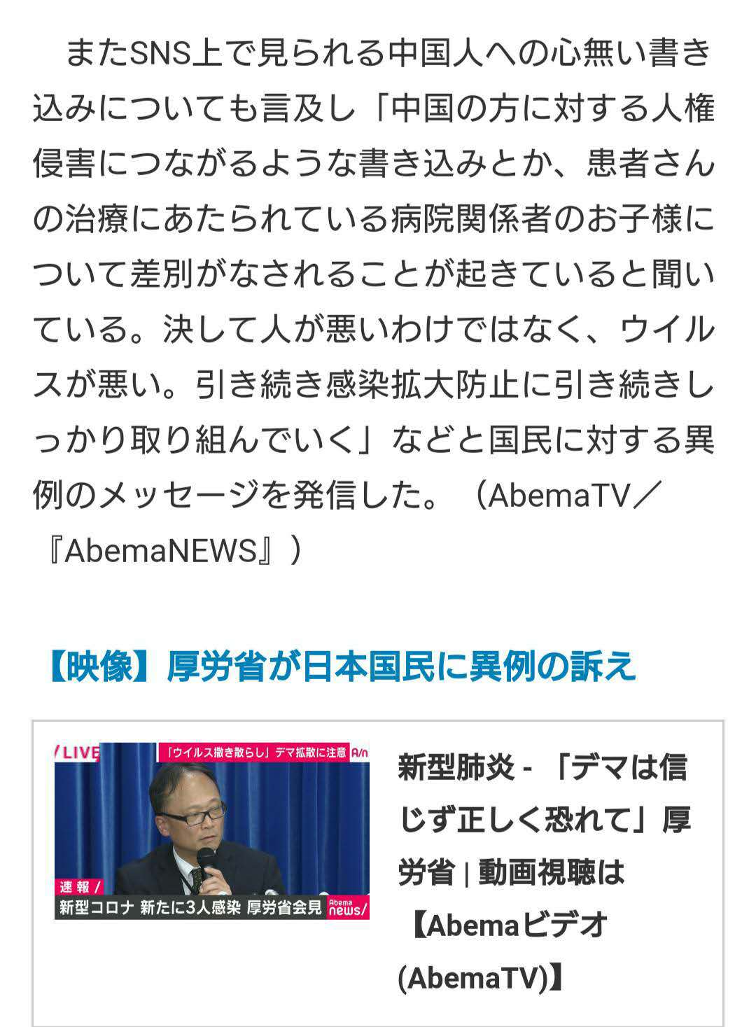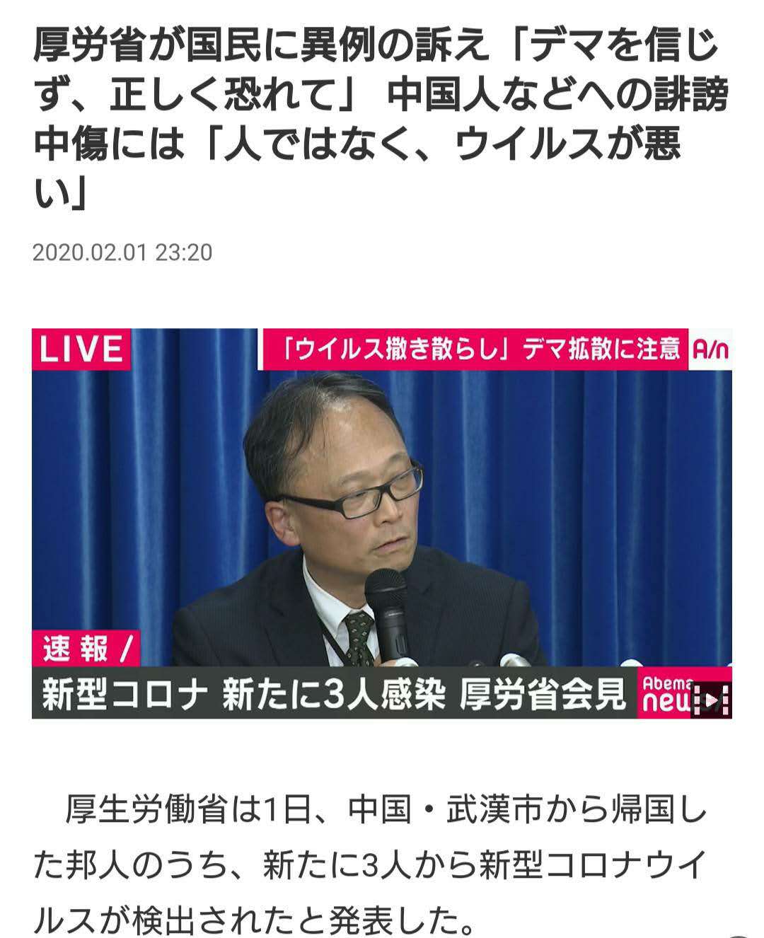 厚生劳动省罕见越权,批判日本网上“一些针对中国人的恶语中伤毫无人性”。提醒没人性的留言者注意:“中国人无辜,病毒有罪”。厚生劳动大臣警告日本网民,“对中国人(敬称,无法翻译)毫无人性的语言攻击已达到侵犯人权的程度”。这话应该警视厅说,这是罕见的越权,可见愤怒到什么地步。