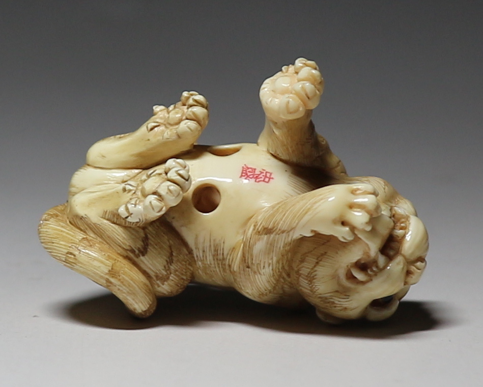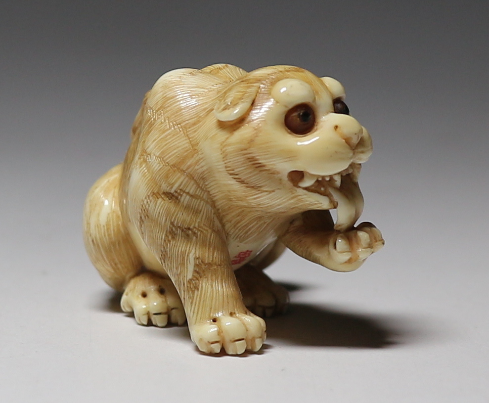 早上没太阳,随手拍了几张我的镇宅虎,效果一般,虎威和虎气凑合着勉强能看出来。大虎长6.3cm,是有著录的世界最大的牙雕根付。大英博物馆和卢浮宫的藏品只有4厘米,都只能称之为“虎”,只有这只堪称“大虎”。
