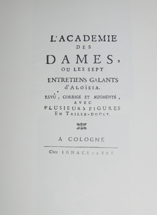 影印18世纪的版本, L’Academie des dames是欧洲语言中最早的色情文本之一。福克森在出版时写下了它的权力,并指出:“情节不断提供新的冲击…因为母亲和丈夫等稳定的人物被披露为具有高度不规则的关系…作为虚假和虚伪证明的[社会和文化],本书是出色的无政府主义的表现”。Pia曾将这个罕见的阿姆斯特丹版本与法语版混为一谈,引起了参考书目间的混乱。标注作者为de Hooghe的版画实际上是Delcroche的原创,他描绘了1770年代和1780年代的一些经典作品。