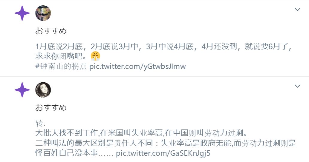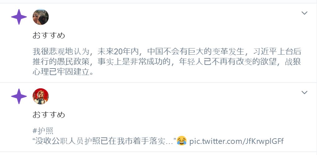 又瞎又聋 推特平均一个月上不了一次,除了日本公家机关,确定没有关注私人。就这样还能收到一堆随手推送,那些成天上推特的就可想而知了。只要让兔子,猪和羊变成聋子和瞎子,野兽就可以永远享受兔肉,猪肉和羊肉。 投稿者: 明珠 明月在天,清辉满地 明珠 の投稿をすべて表示