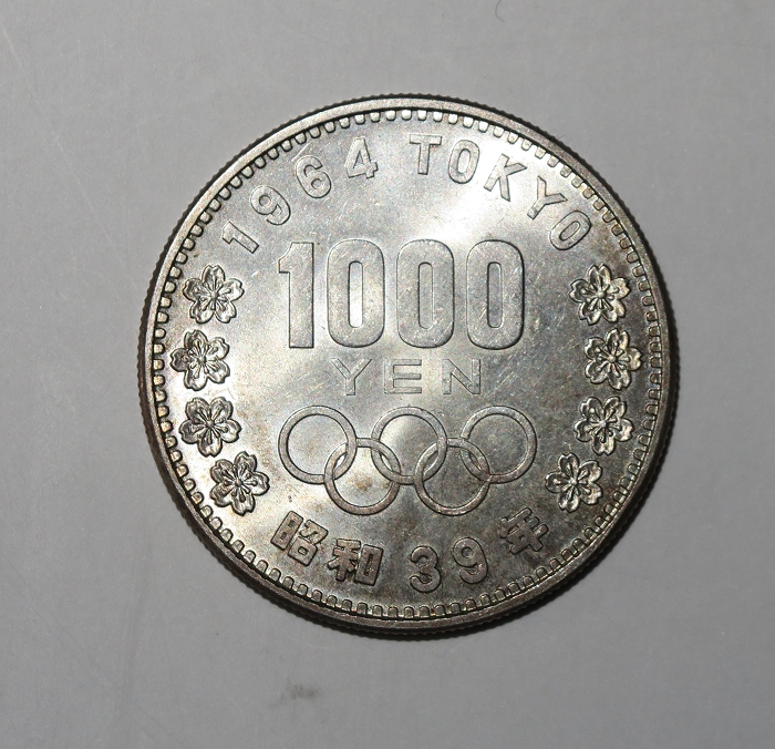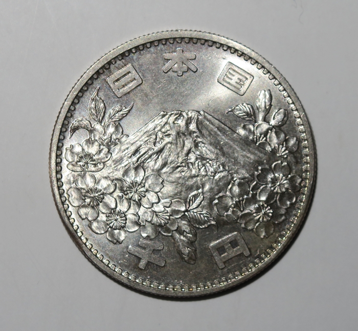 1964年,日本第一次承办夏季奥运会,由此决定发行银币作为纪念。当初设想的是发行100日元银币,由于东京奥委会的强烈要求,加上当时日本国力达到巅峰,因此最终决定发行大尺寸的高额1000日元银币,图案为造币局设计的象征日本的富士山和樱花。发行采取预约限定制,每一个日本家庭只能买一枚,也即一本户口簿只能买一枚,因此发行量1500万1516枚。
