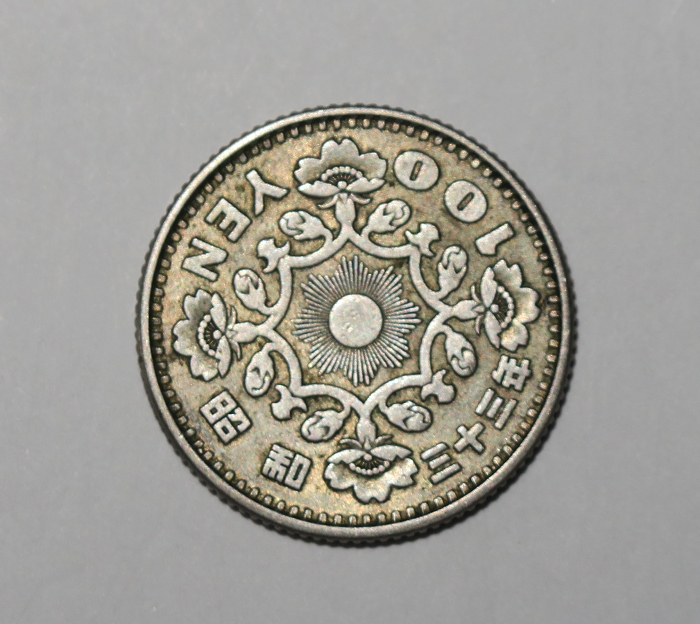 1957年,战败的日本再次发行银币以彰显财力。作为再次崛起的象征,决定银币正面凤凰,背面旭日,面值100日元,在当时是最高面额的硬币(同年发行的5000日元钞票亦为当时最高面额的纸币)。