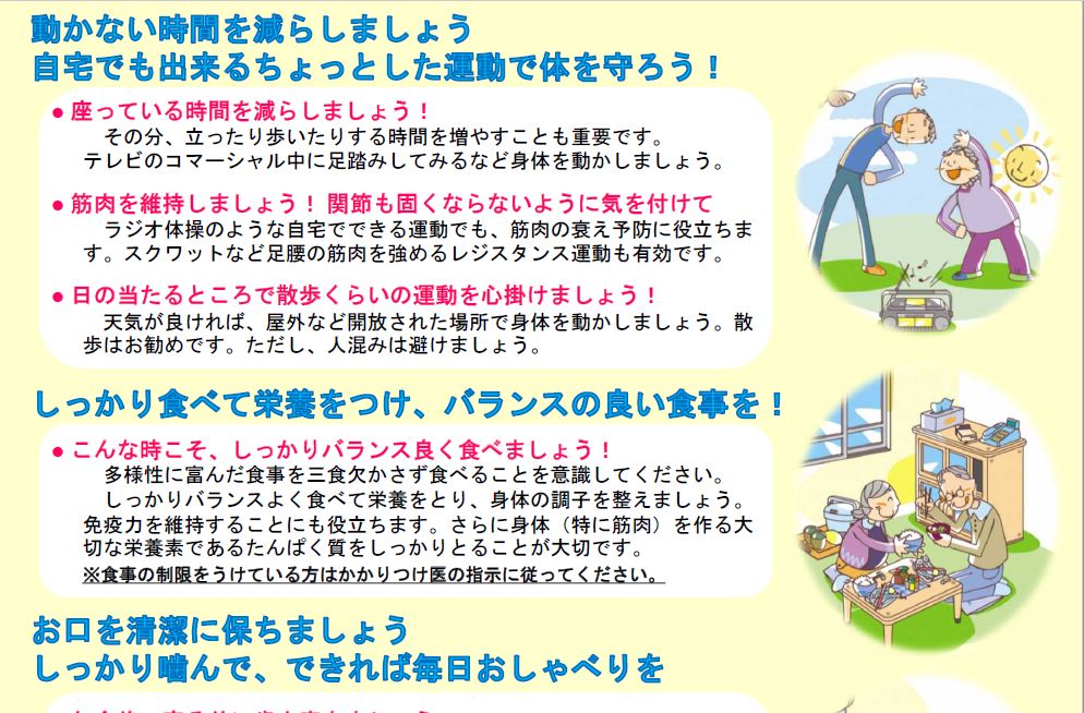 動かない(生活が不活発な)状態が続くことにより、心身の機能が低下して「動けなくなる」ことが懸念されます。また、転倒などを予防するためにも、日頃からの運動が大切。