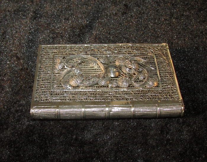 罕见线装书造型,极具收藏价值的实用器。纯银打造,工艺精湛。通体以精细银花银丝编制:先以粗银丝编成卷草纹框架,后以极细银花丝织成各种图案,贴焊框架内。正面浮雕蟠龙戏珠,栩栩如生,背面镂空勾勒花草,细腻规整。罕见的按钮式开关,按下盒侧面小按钮即可完全弹开,弹簧片功能正常。整体品相完好,开合紧密。形象生动,华而不俗,玲珑雅致,精巧灵动,妙趣盎然。