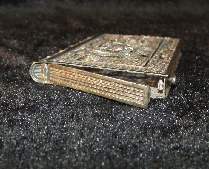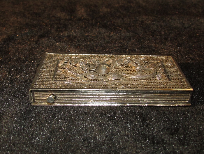 罕见线装书造型,极具收藏价值的实用器。纯银打造,工艺精湛。通体以精细银花银丝编制:先以粗银丝编成卷草纹框架,后以极细银花丝织成各种图案,贴焊框架内。正面浮雕蟠龙戏珠,栩栩如生,背面镂空勾勒花草,细腻规整。罕见的按钮式开关,按下盒侧面小按钮即可完全弹开,弹簧片功能正常。整体品相完好,开合紧密。形象生动,华而不俗,玲珑雅致,精巧灵动,妙趣盎然。
