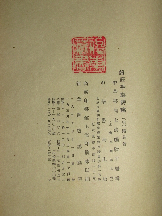 不分卷2册一函全,明归庄著,中华书局上海编辑所编辑,中华书局出版,商务印书馆上海印刷厂印刷;一九五九年十一月第一版第一次印刷,印书1600部,内特藏本600部,定价(特)五元。前有中华书局上海编辑所一九五九年八月前言,藏印四:俊东藏书、黄俊东。