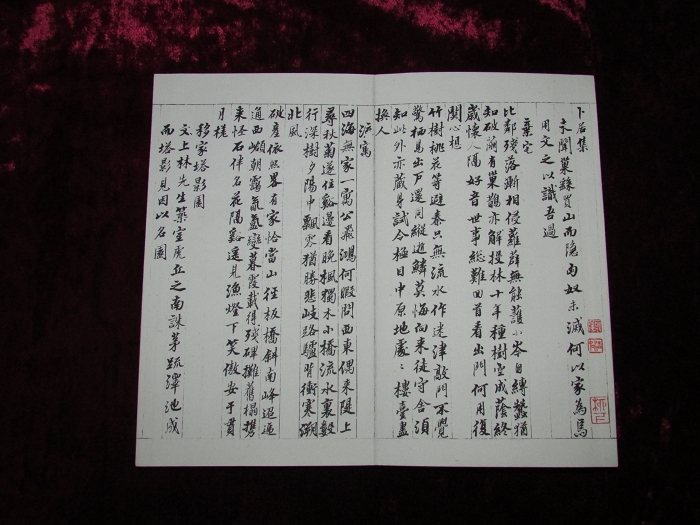 书长24.5×14cm,半框20×13.9cm,12行18字,少量修改。20开40叶,宋锦封面,品好。此册原藏上海市文物保管委员会,收录崇祯十六年(1643)至顺治十五年(1658)所作诗约百首,皆为民国间东方学会刊塔影园集(殷礼在斯堂丛书)所未收。影印极精,几可乱真。存世多蝴蝶装普本,特藏本罕见。