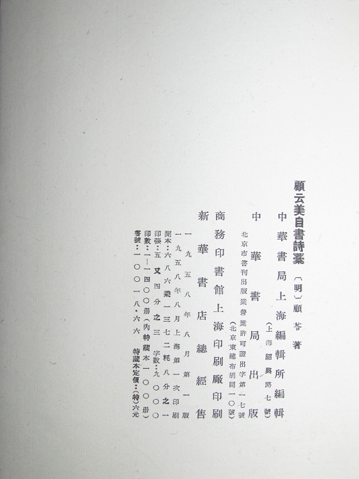 锦面折装一册全,明顾苓著,中华书局上海编辑所编辑,中华书局出版,商务印书馆上海印刷厂印刷;一九五八年八月第一版第一次印刷,印书400册,内特藏本100册,定价(特)六元。