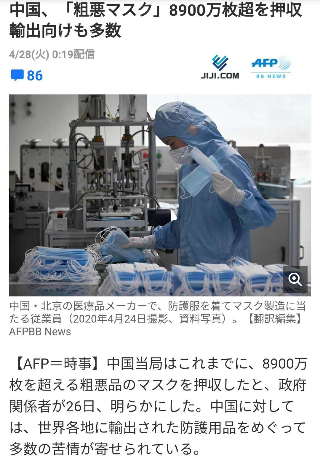 涉及中国的从来没有正面信息,憋了一个多月,久违的负面信息又来了。出口8900万枚劣质口罩只是冰山一角,日本没空算账,相信美国一定有空算账。