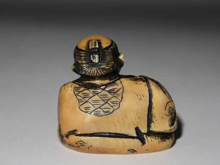 购于银座古玩城,明治时代的塑料仿象牙。没有绳孔,不能叫根付,只能算迷你摆件。日本各地古玩城和雅虎所谓的“象牙根付”,99%都是此类货色。价格合适买一个回去当样品不错,不触摸实物,永远无法分辨真假。
