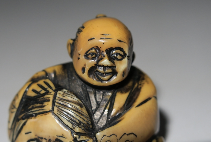 アンティークモール銀座で購入しあた明治時代の練り物根付。紐通しもないので、根付とは言えない。ヤフオクか骨董市で売られている所謂”象牙根付”が、殆どこのような練り物根付。手に取って触らない限り、一生分からないだろう。ぜひ手頃な値段で入手して、鑑定に勉強しなさい。