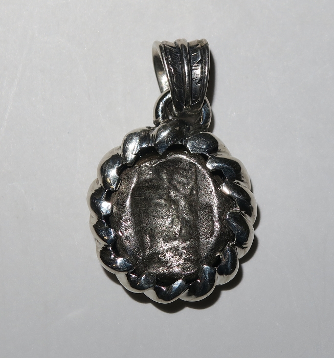 裏面の長方形の陰刻印は、表面のモティーフを打ち出す際に、鉄器などで下部に固定していた銀の塊を打刻した跡とみられる。