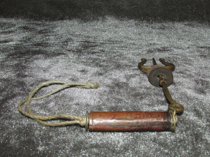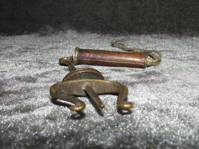 全长约12.8cm,重约54.82克,清中期制。附三枚铜钱,一康熙通宝,一宽永通宝,一磨损难辨。三叉戟为道教法器,具有威慑鬼怪、辟邪压胜功效。