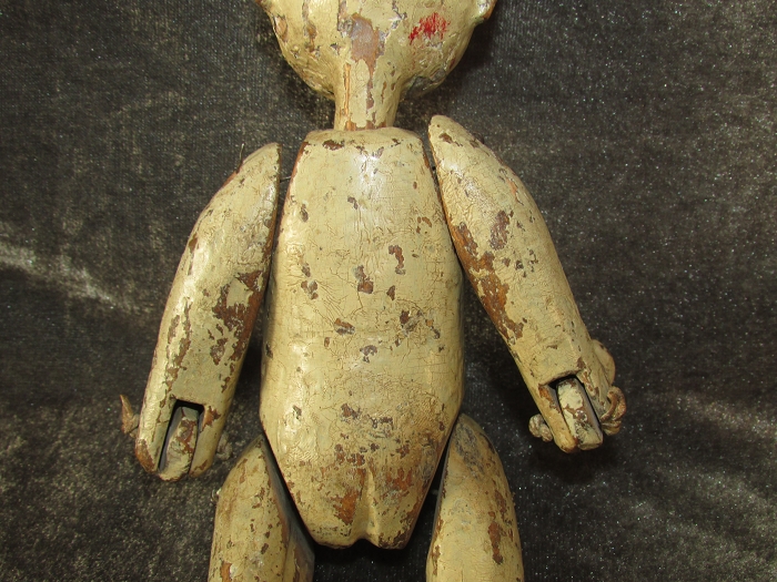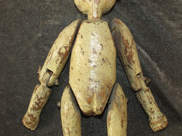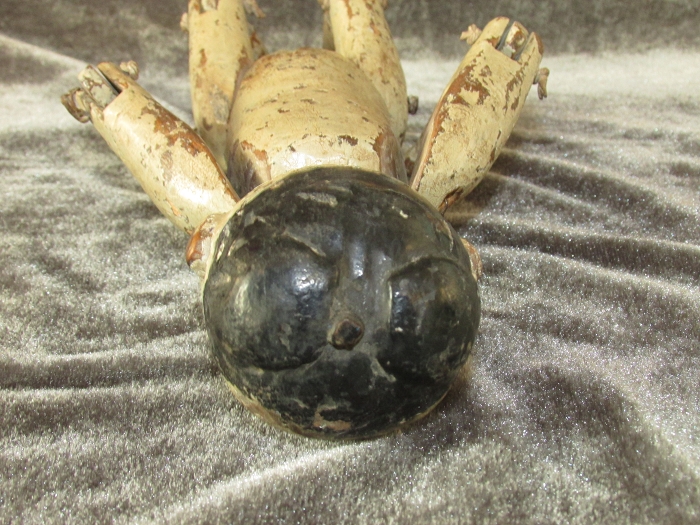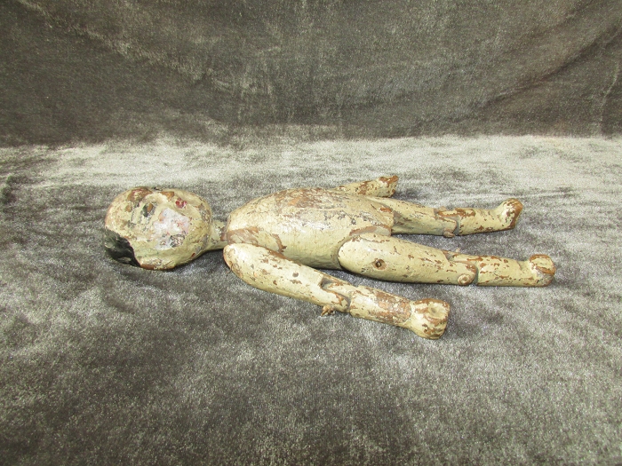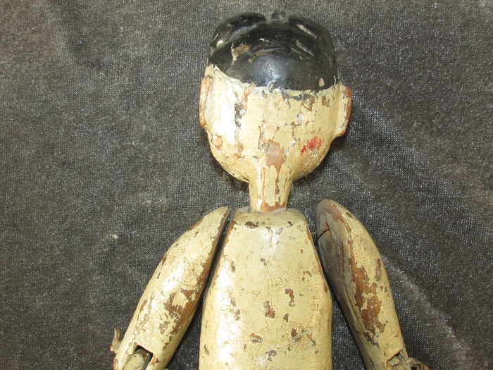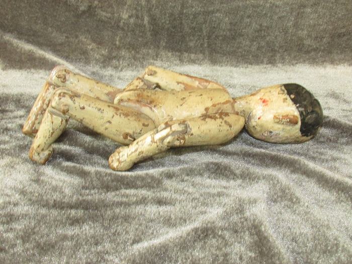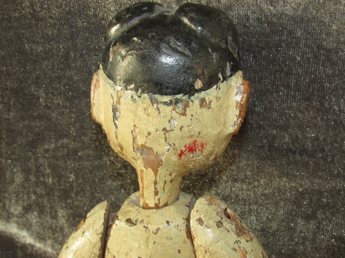 身长约24.5,头约6.5,臂约12.5,躯约10.5,腿约12cm,明末清初木雕。鹅蛋脸粉彩精美,螺旋发髻逼真;头顶中央部扎铁钉,可证为射偶人无疑。封神演义钉头七箭书所用,即为此种人偶。软身制作,全身各关节均可活动;线条洗练,完整无修。