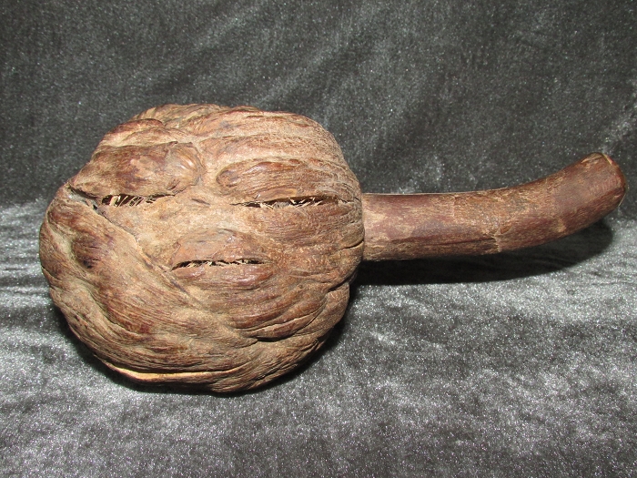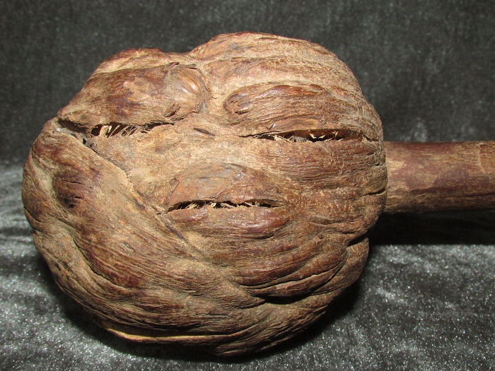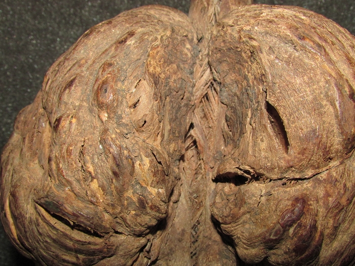 水平放置时,一侧酷似人脸,另一侧显而易见是硕大勃起挺立之阳物,呈两瓣圆形突出的树瘤则是两侧睾丸。竖立放置时,树瘤中心部位酷似一女阴,大小阴唇清晰可见。除两端切割痕迹外,整物浑然天成,无任何后期加工,非常难得。