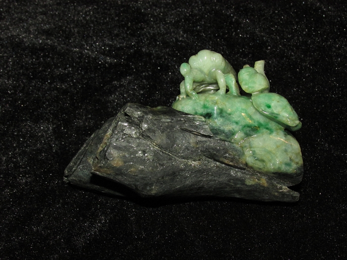 约10.2×8.1×7.8cm,重约678克,翡翠原石俏色,有不明显细绺,文物商店库存。