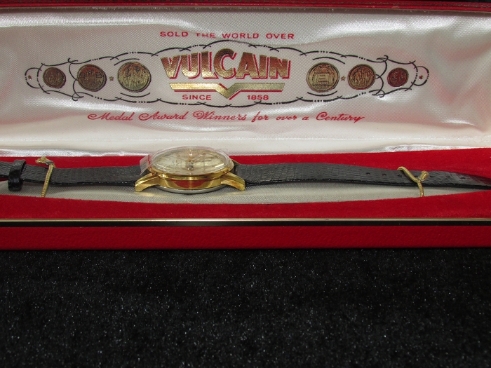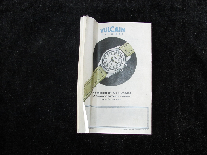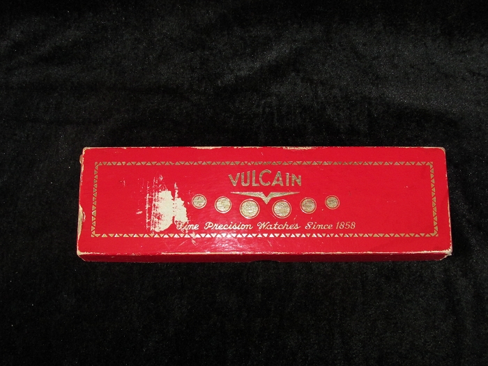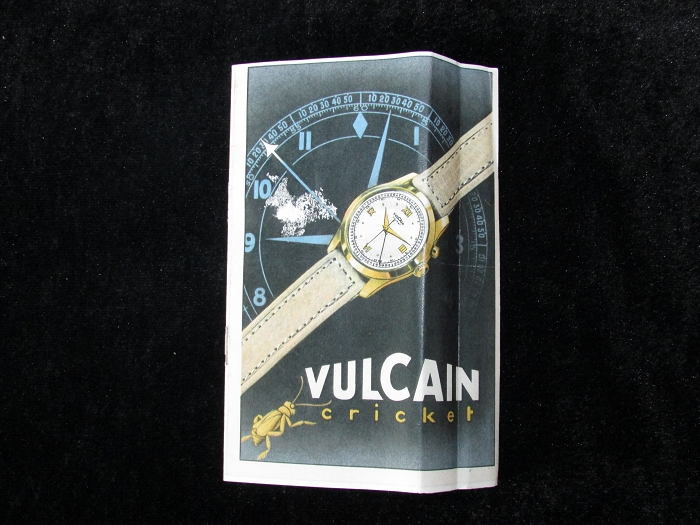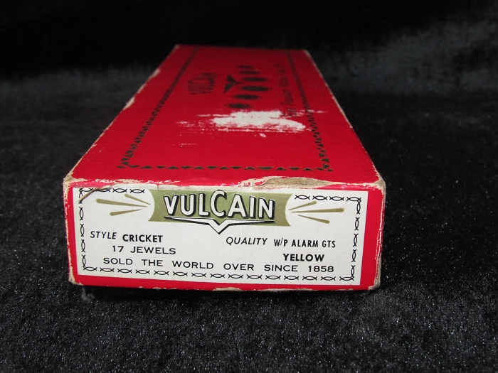 此表是一只产于1950年代而未用过的崭新仓表老古董,附有原装外纸盒,内铁盒双层包装盒、说明书、表蒙透明膜一应俱全,实为罕见难得之收藏珍品。外盒正面上方印有VULCAIN及其商标,中间为历次表展所获奖牌,下方印Fine Pnecision Watches Since 1858;侧面印VULCAIN及其商标,STYLE CRICKET(蟋蟀风格),QUALITY W/P ALARM GTS(高性能闹铃品质),17 JEWELS(17钻),YELLOW(黄色),SOLD THE WORLD OVER SINCE 1958(1858年开始面向全球发售)。