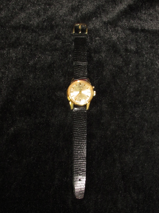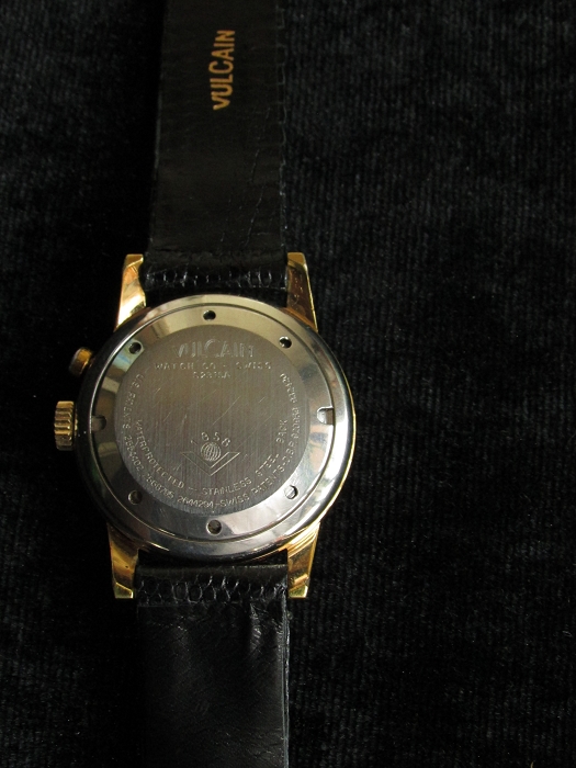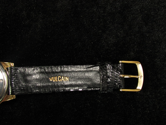 不连冠表径3.4cm,镀金表壳,不锈钢表背,简易罗马数字表盘,12点下方有VULCAIN及其商标,cricket(蟋蟀);6点上方WATER RPROTECTED(防水),下方SWISS MADE(瑞士制造)。表蒙材质不明,疑似玻璃。表背刻VULCAIN,WATCH CO-SWISS(瑞士凡尔根表业有限公司),S2315A(表号),1858(公司成立年),WATER RPROTECTED(防水)- STAINLESS STEEL BACK(不锈钢表背),U.S.PATENTS(美国专利号) 254402 2568795 2644294- SWISS PATENTS-D.B.P. (瑞士专利号)920956 932420;原装鳄鱼(蜥蜴)皮表带,有烫金VULCAIN字样。17钻,总重42.75克,约40年代末50年代初制造,库存新品,无使用痕迹(仓表)。满弦60下,闹铃响亮逼真,走时精确。
