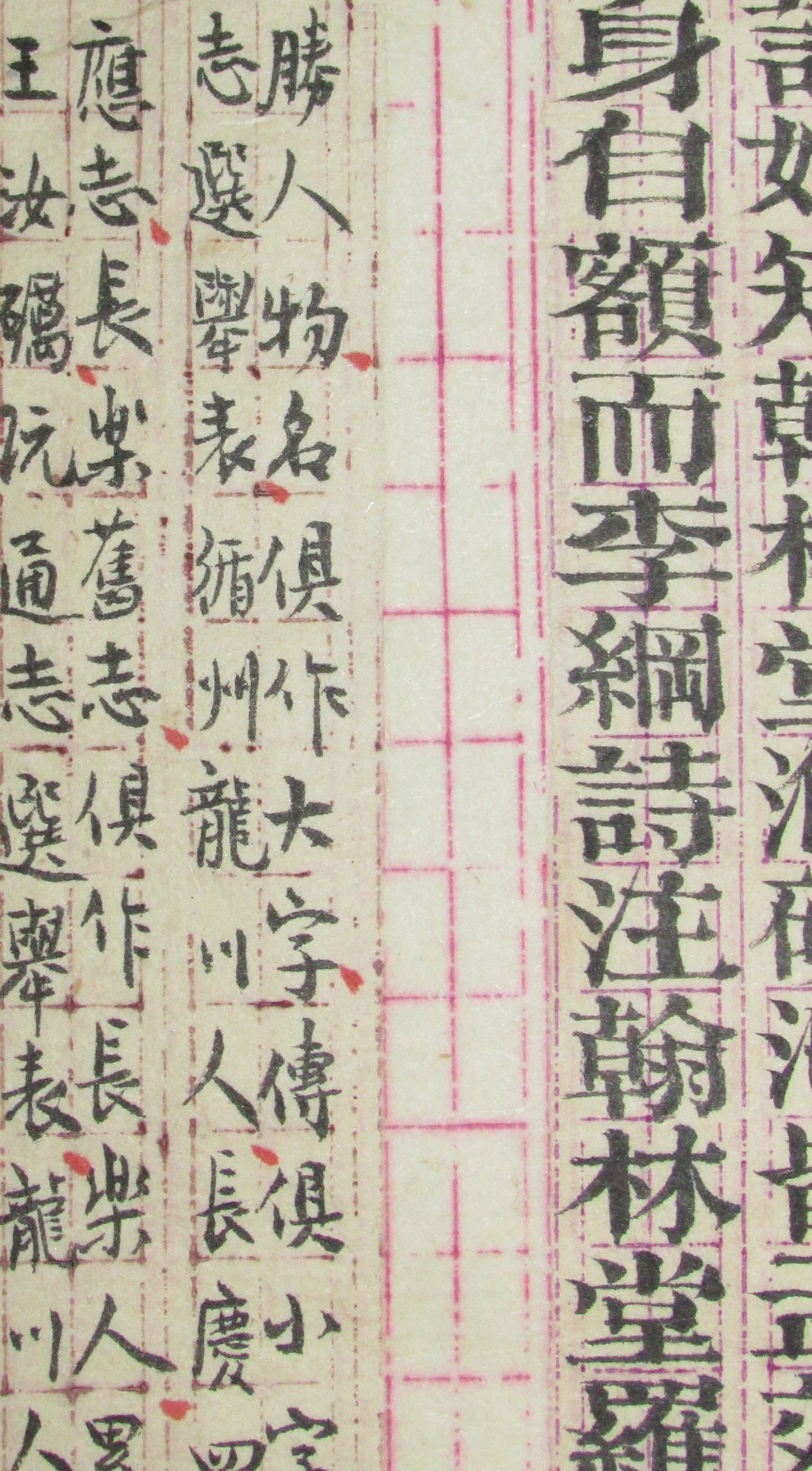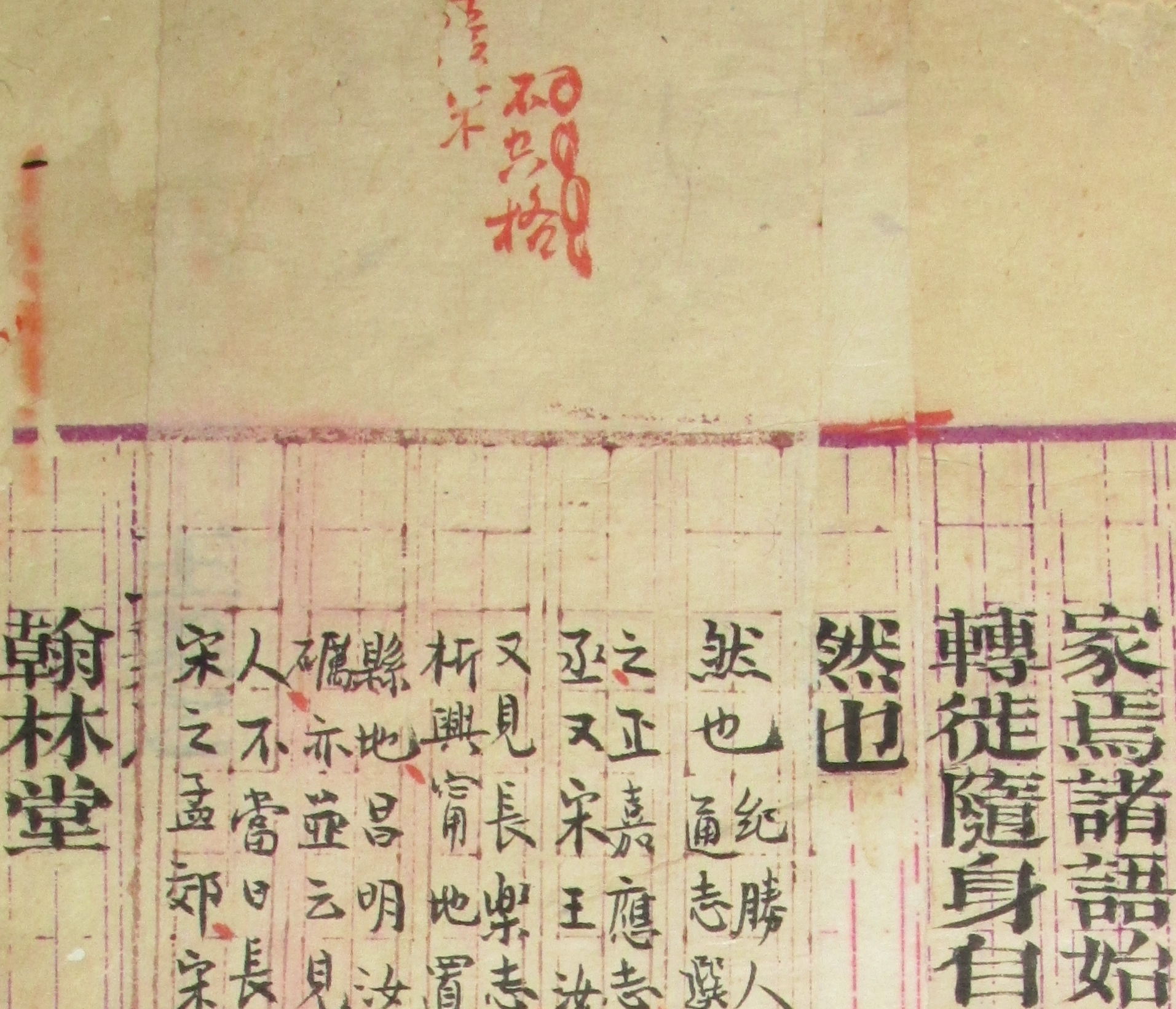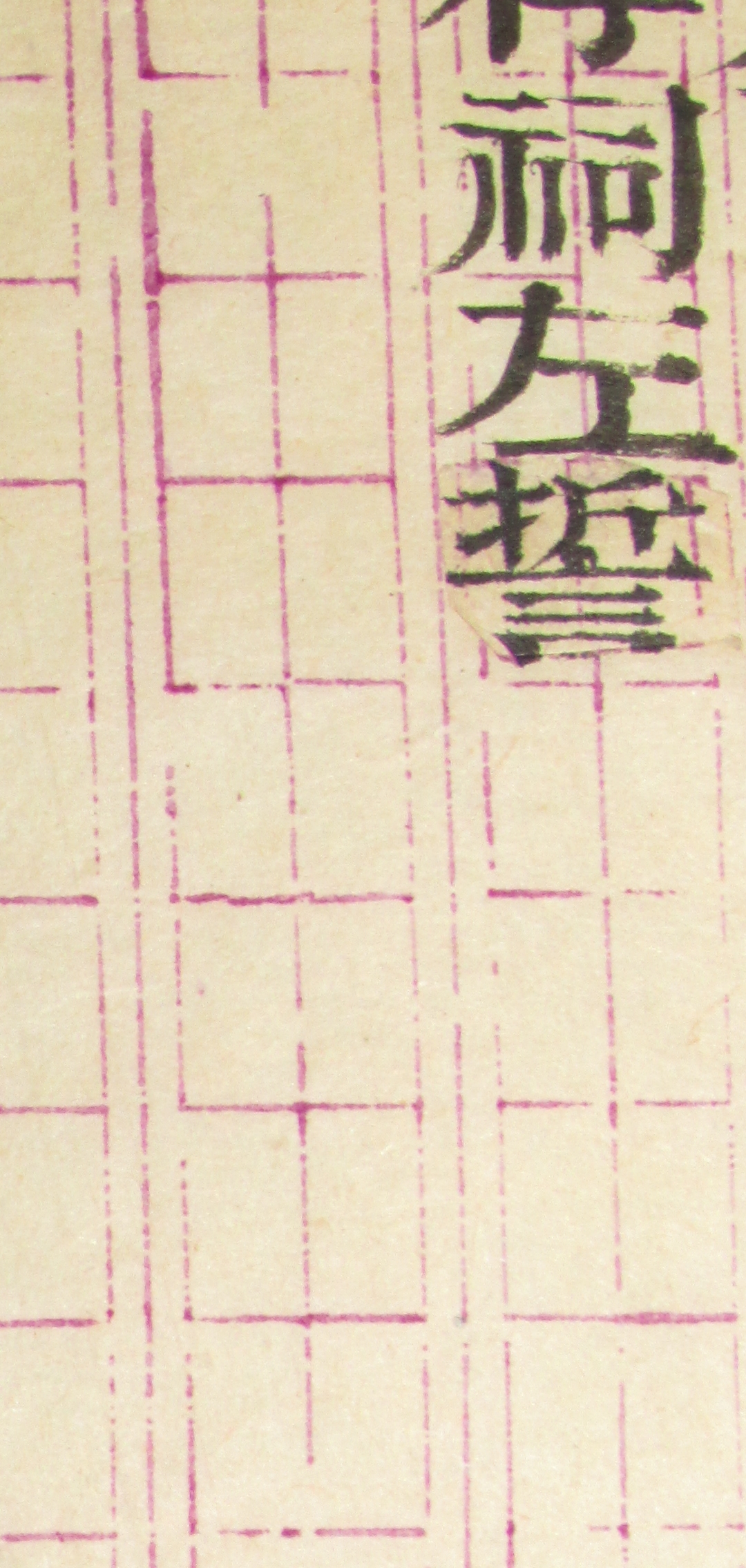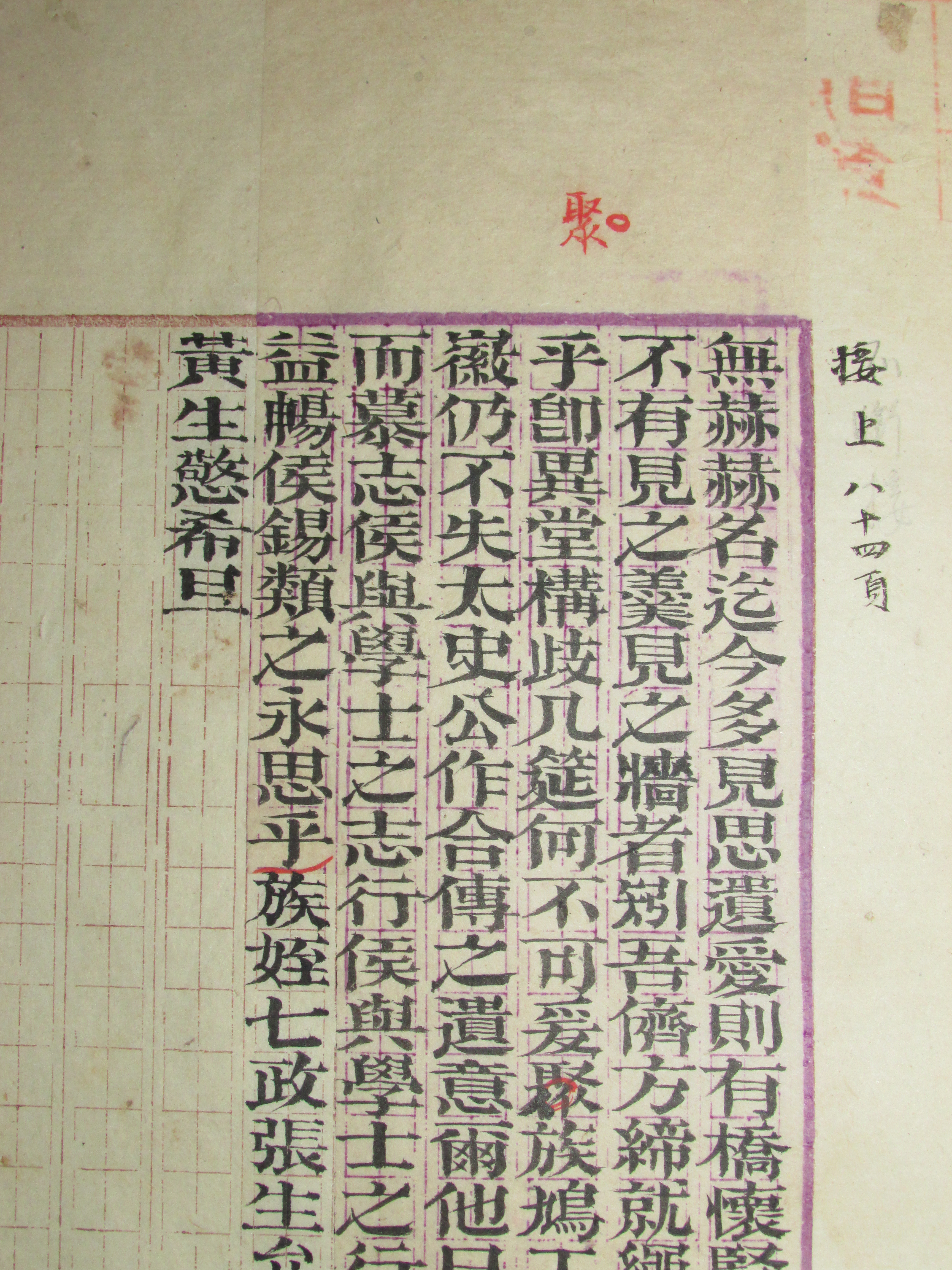 以样稿实物看来,写样肯定是方(花)格,或者说惟方(花)格才能称之为写样。但颜色未必只限于红色,也可是紫色乃至褐色,颜色不一,或许出于校勘之考虑。此外,两行之间留有空白的一行,中间亦有一条直线,应为刻版时的“界线”,也即书成后版本学术语所谓的“有界”。