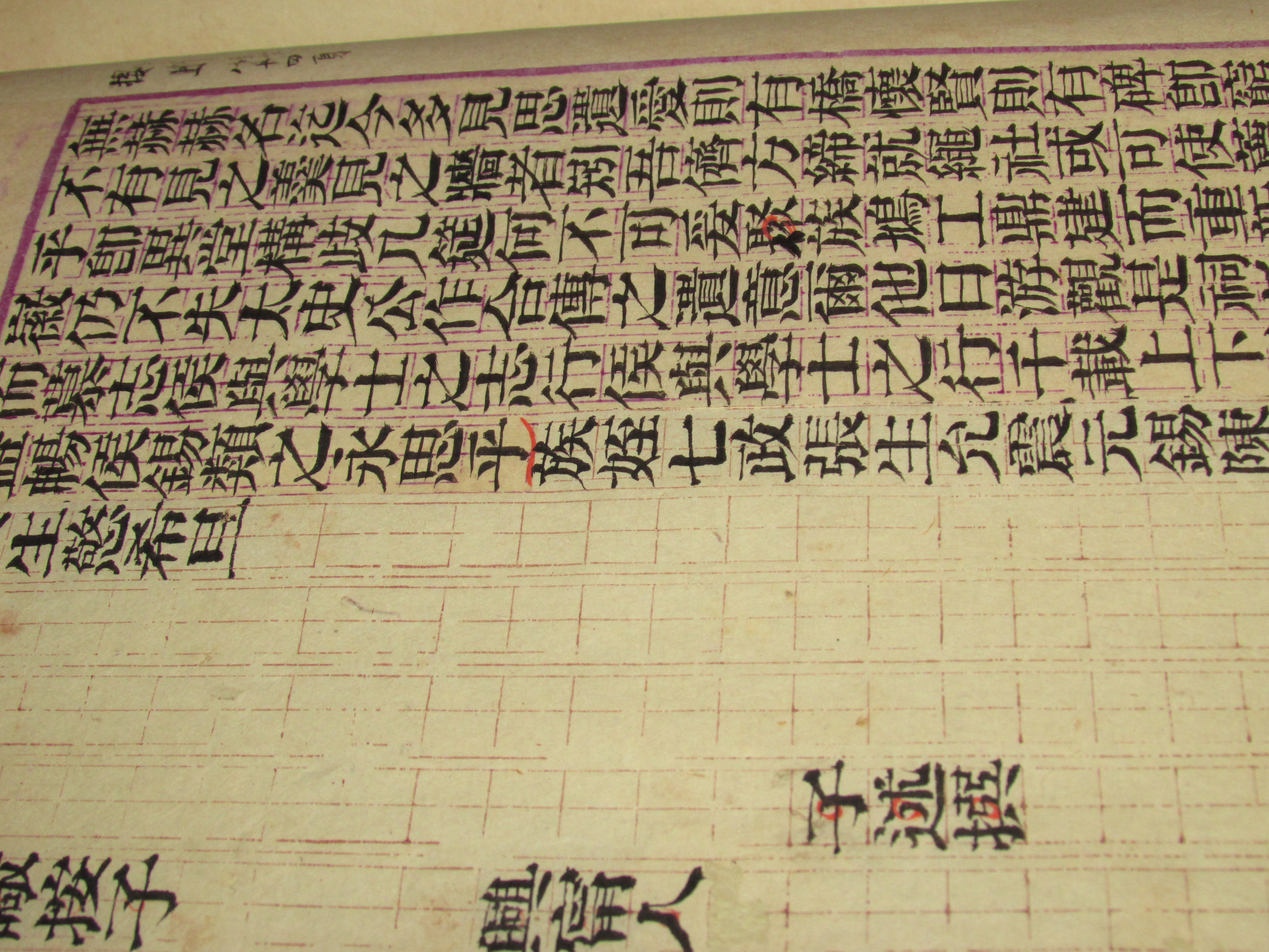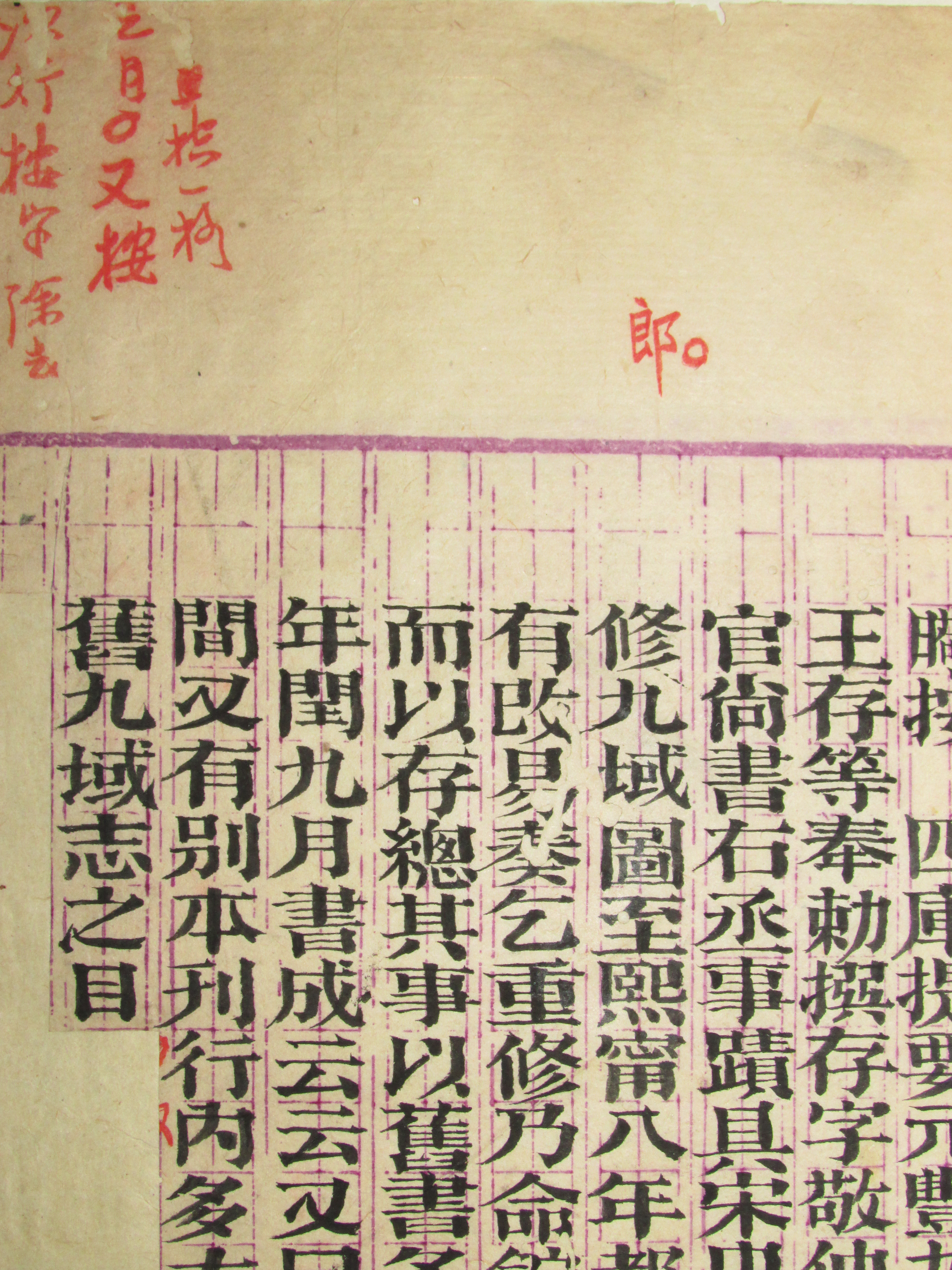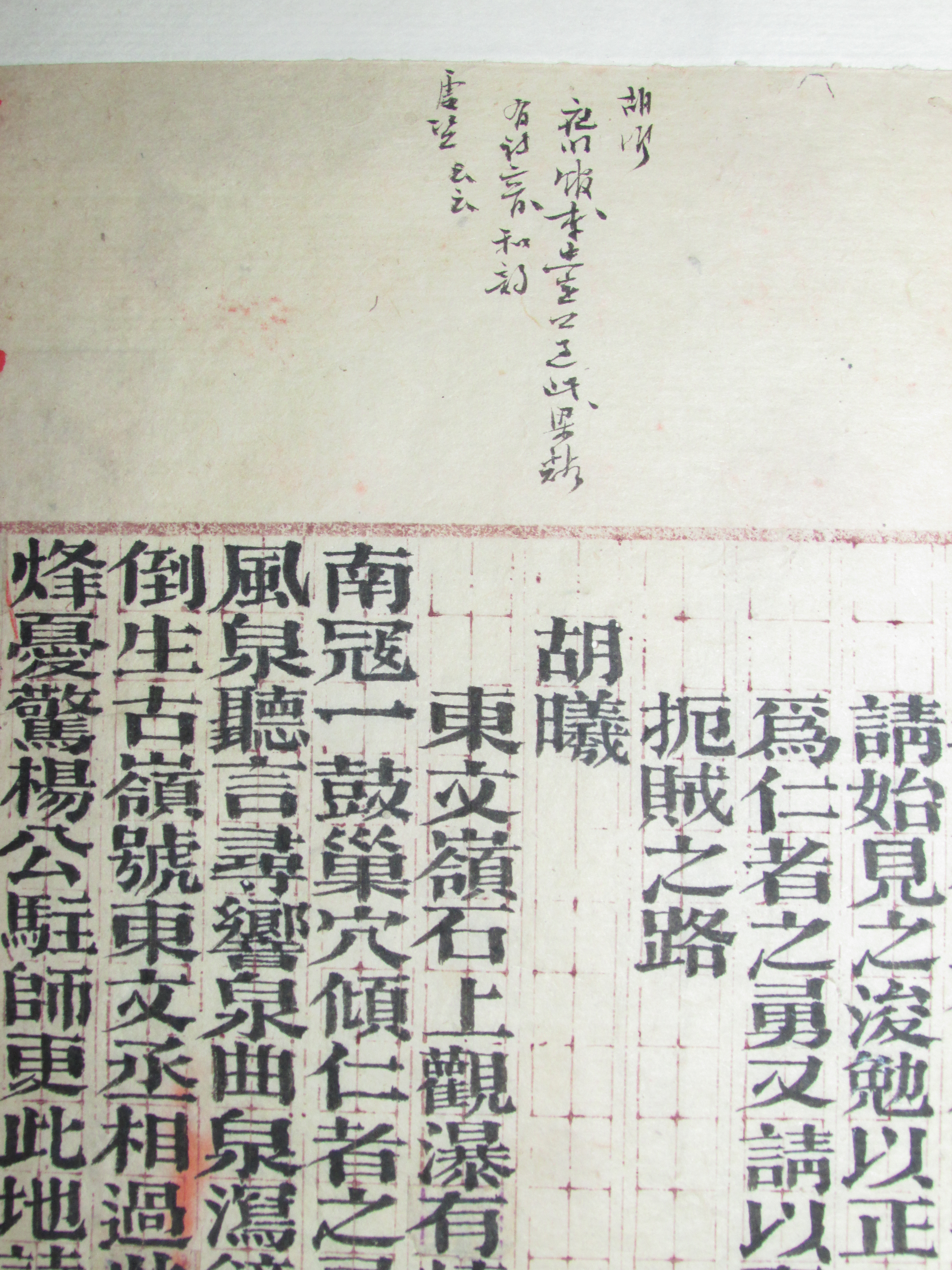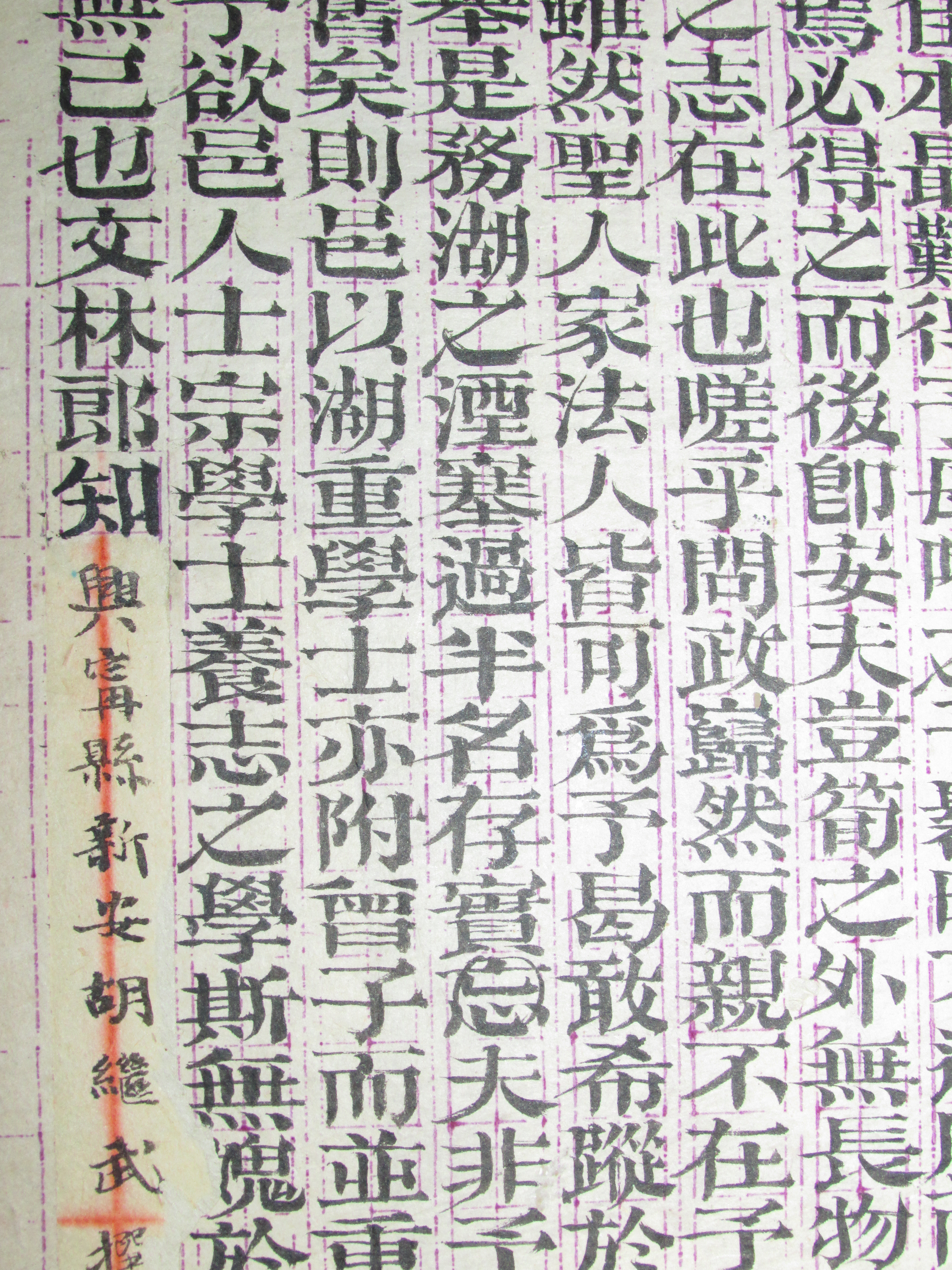 以样稿实物看来,写样肯定是方(花)格,或者说惟方(花)格才能称之为写样。但颜色未必只限于红色,也可是紫色乃至褐色,颜色不一,或许出于校勘之考虑。此外,两行之间留有空白的一行,中间亦有一条直线,应为刻版时的“界线”,也即书成后版本学术语所谓的“有界”。