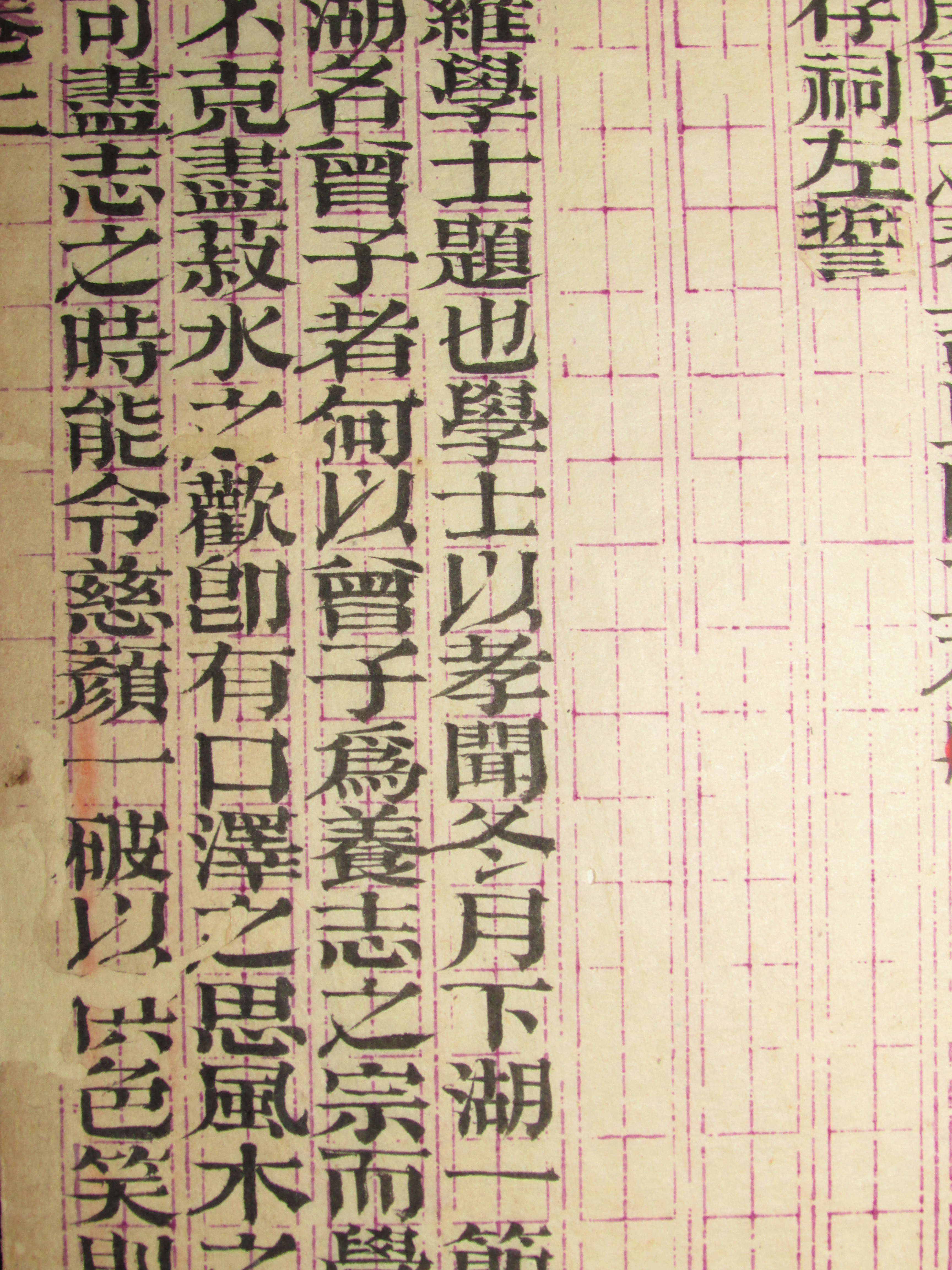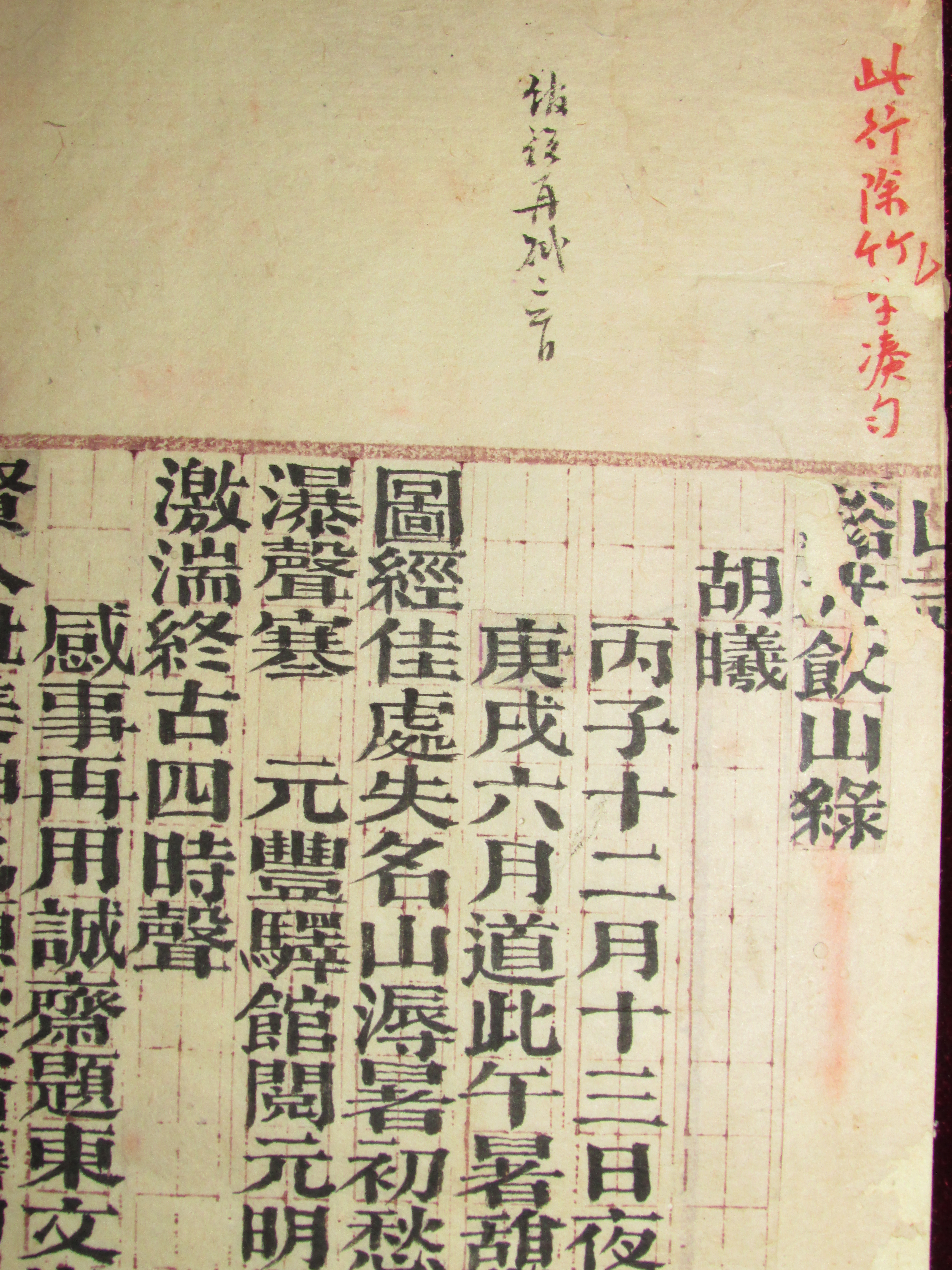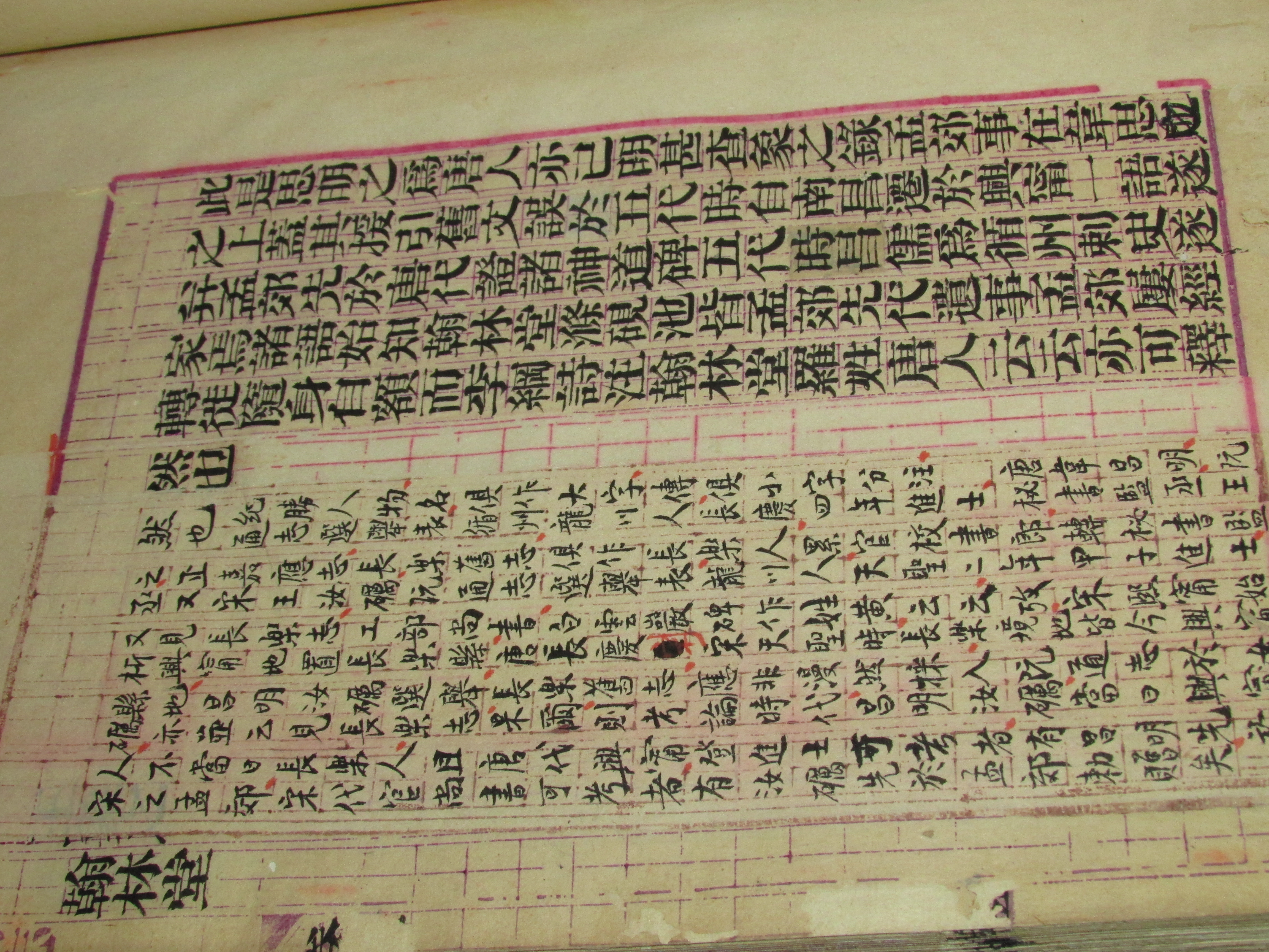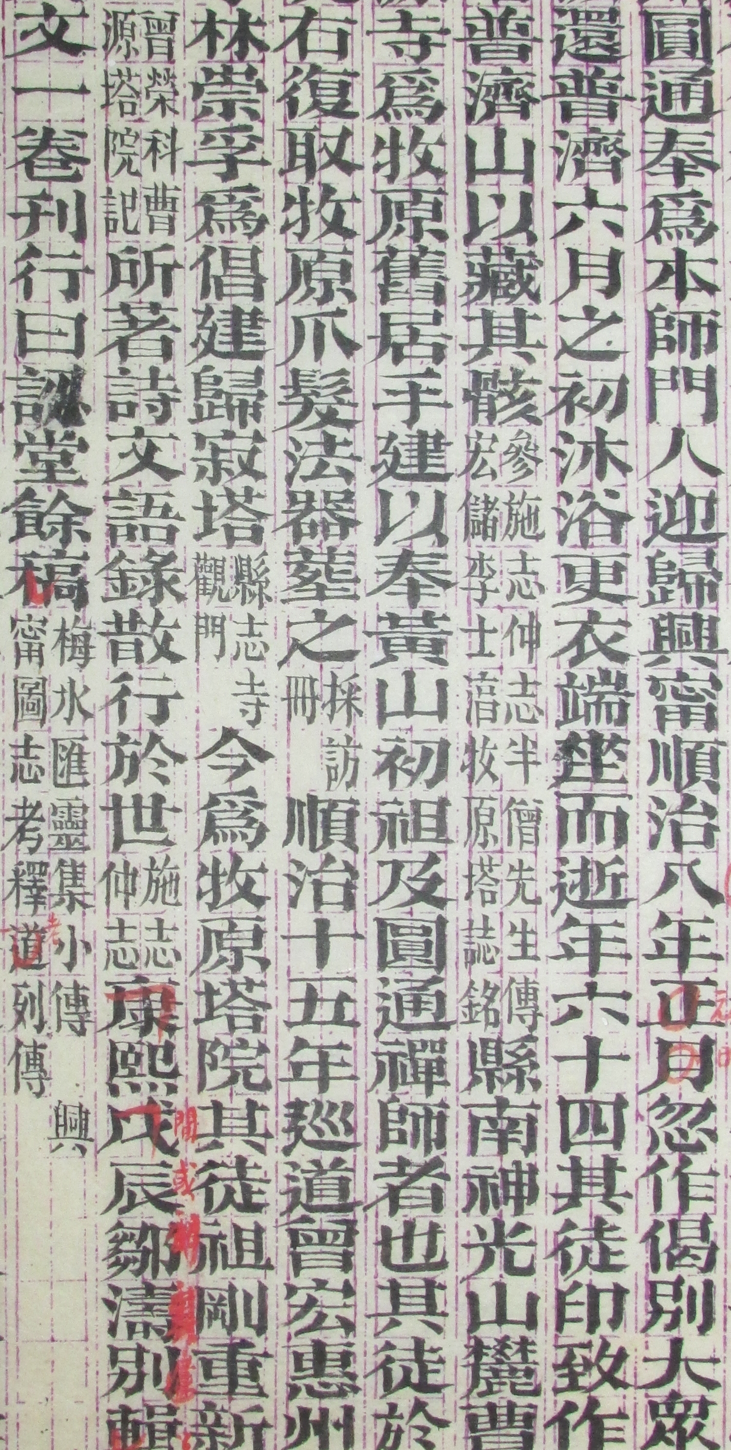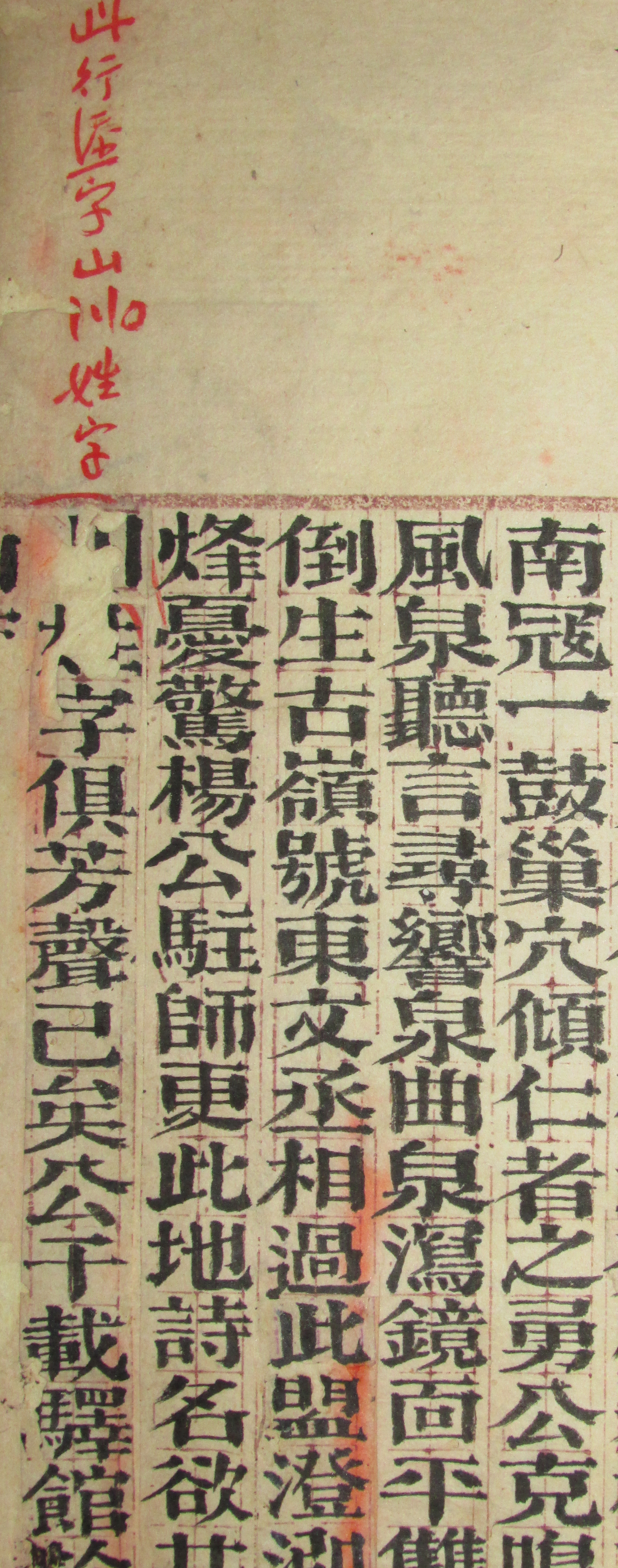 以样稿实物看来,写样肯定是方(花)格,或者说惟方(花)格才能称之为写样。但颜色未必只限于红色,也可是紫色乃至褐色,颜色不一,或许出于校勘之考虑。此外,两行之间留有空白的一行,中间亦有一条直线,应为刻版时的“界线”,也即书成后版本学术语所谓的“有界”。
