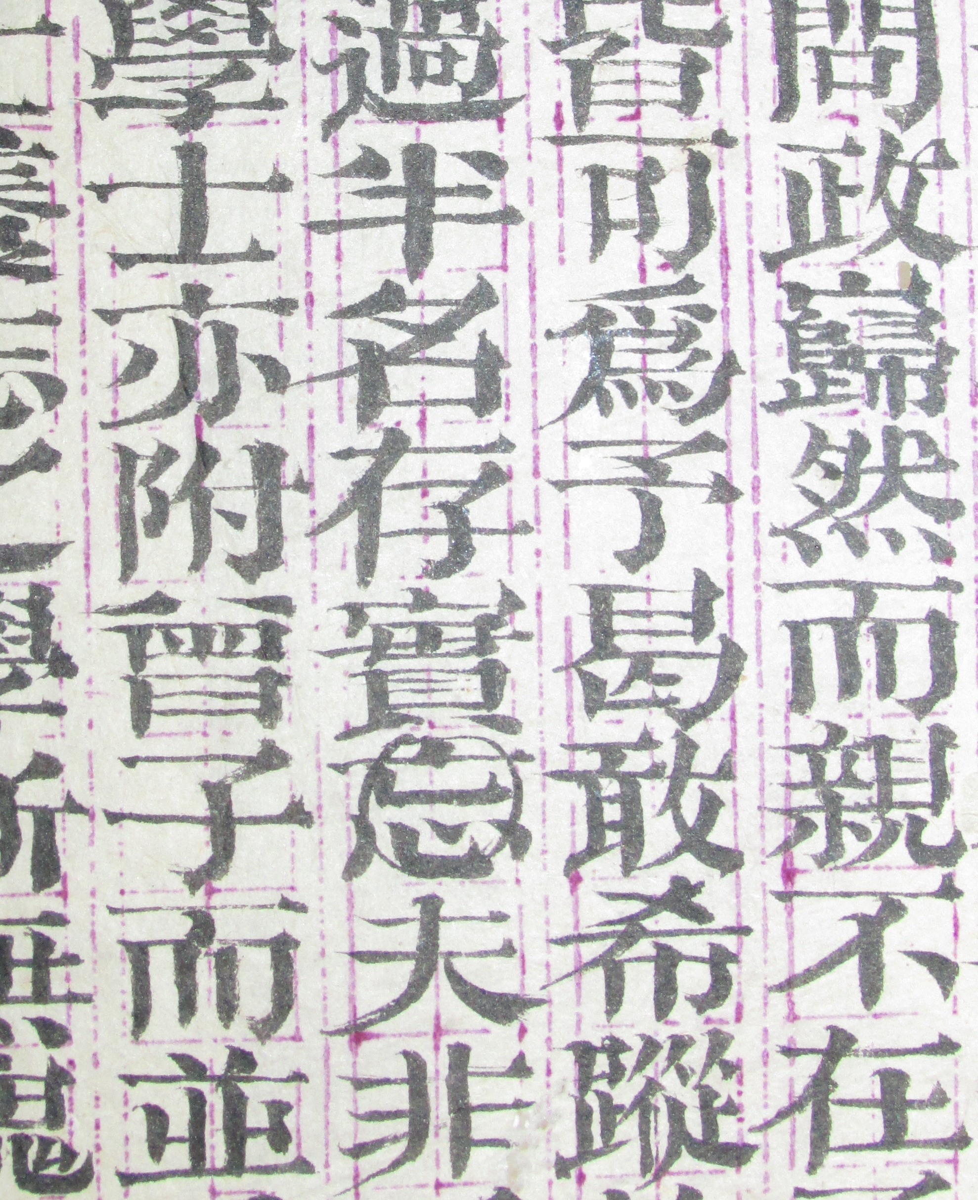 试印本不公开发行,以故名称不一,印样外,又有校样,镌样等别名,专指雕版刻成后的最初印样。以实物看来,三校主要针对刻字,具体包括指正刻字错误、改正字体不规范、修补笔画断缺三大部分,兼及剔除重复字和修补栏线两处细节。校正通常注于眉端,字里行间亦偶有夹注。
