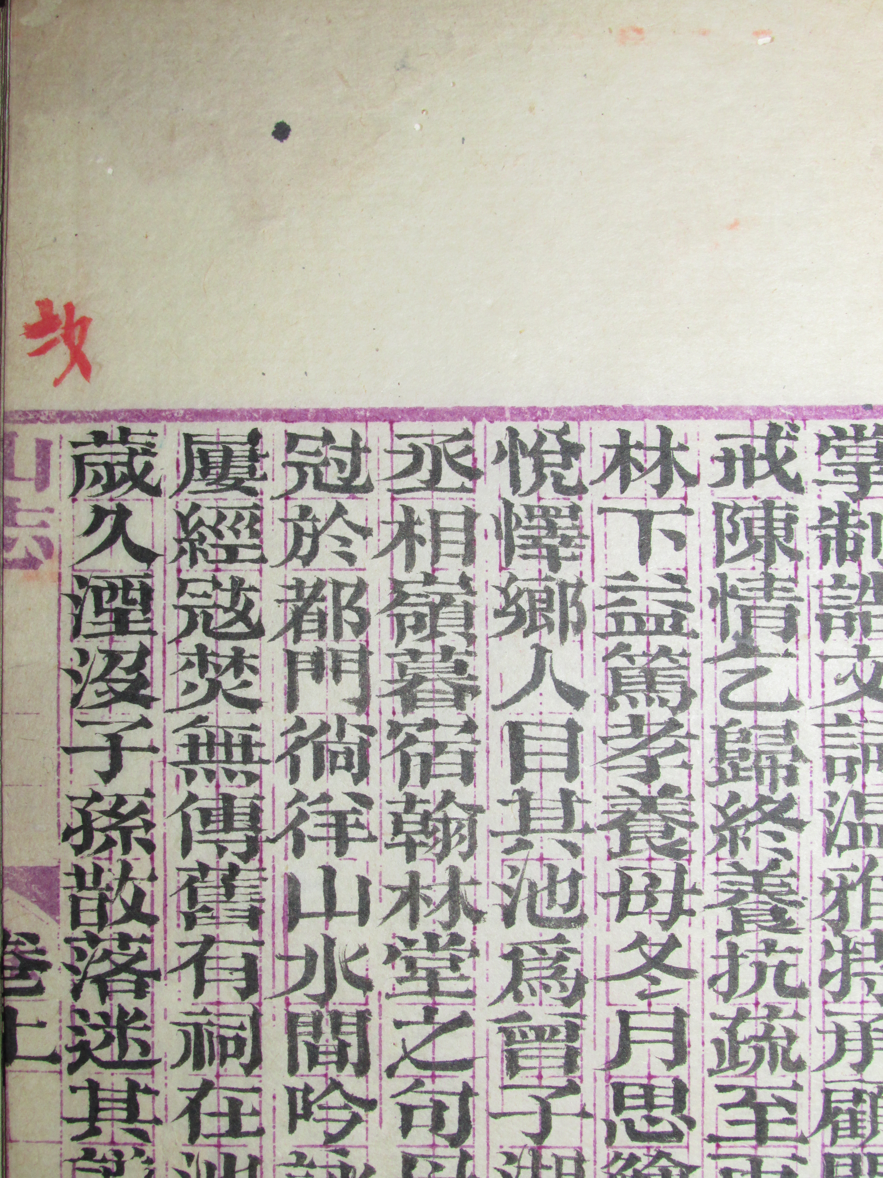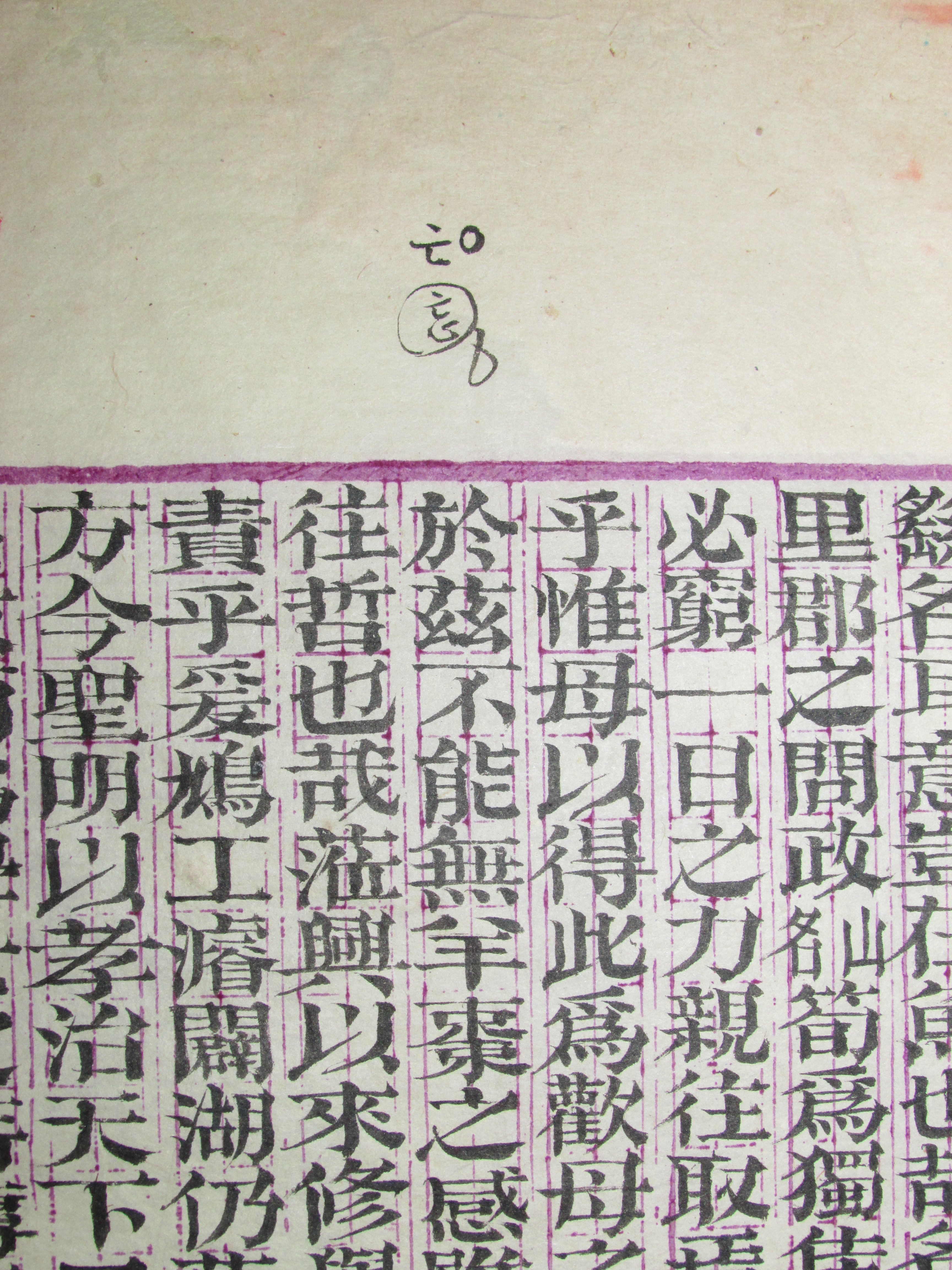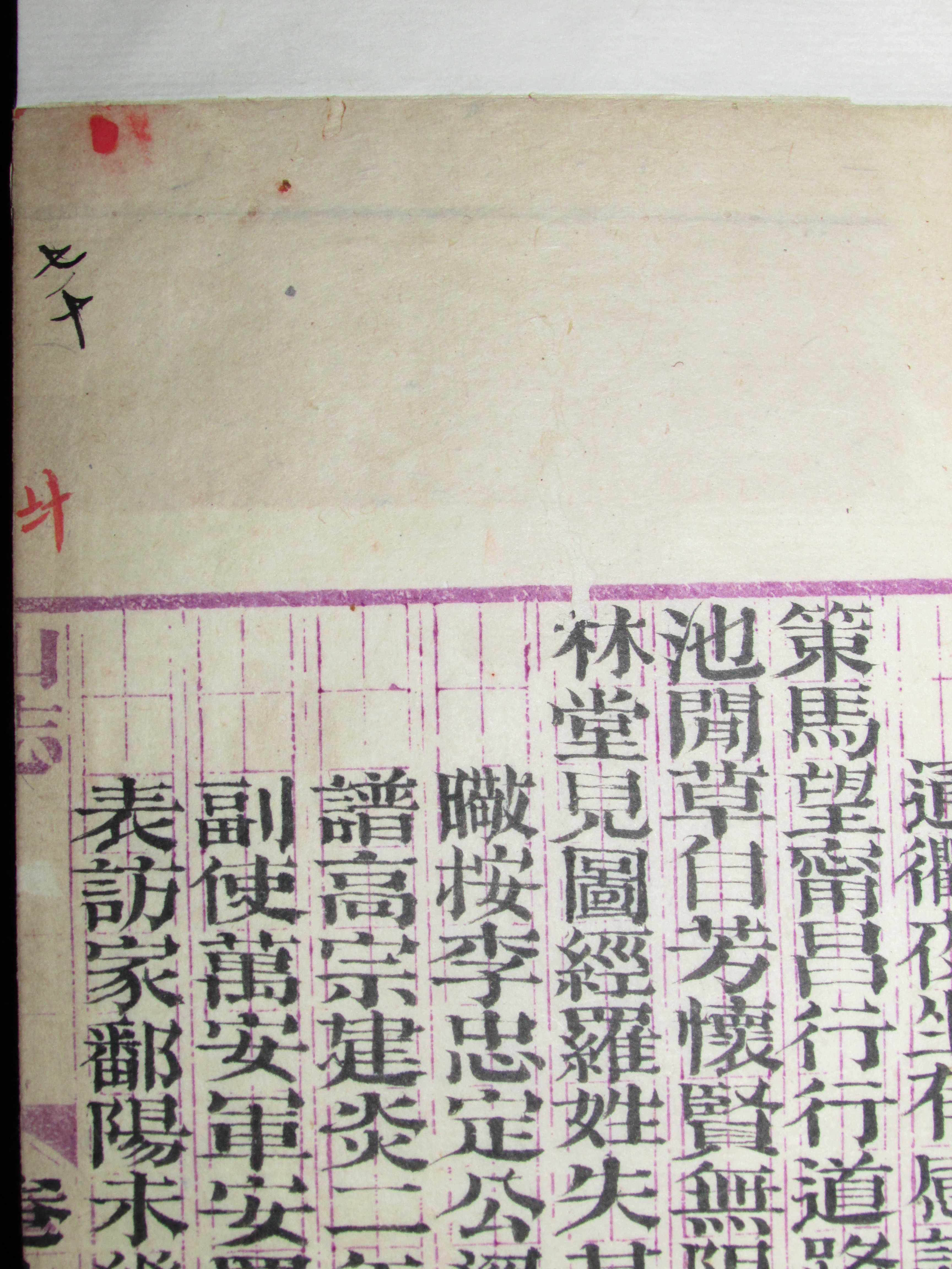 以样稿实物看来,写样肯定是方(花)格,或者说惟方(花)格才能称之为写样。但颜色未必只限于红色,也可是紫色乃至褐色,颜色不一,或许出于校勘之考虑。此外,两行之间留有空白的一行,中间亦有一条直线,应为刻版时的“界线”,也即书成后版本学术语所谓的“有界”。