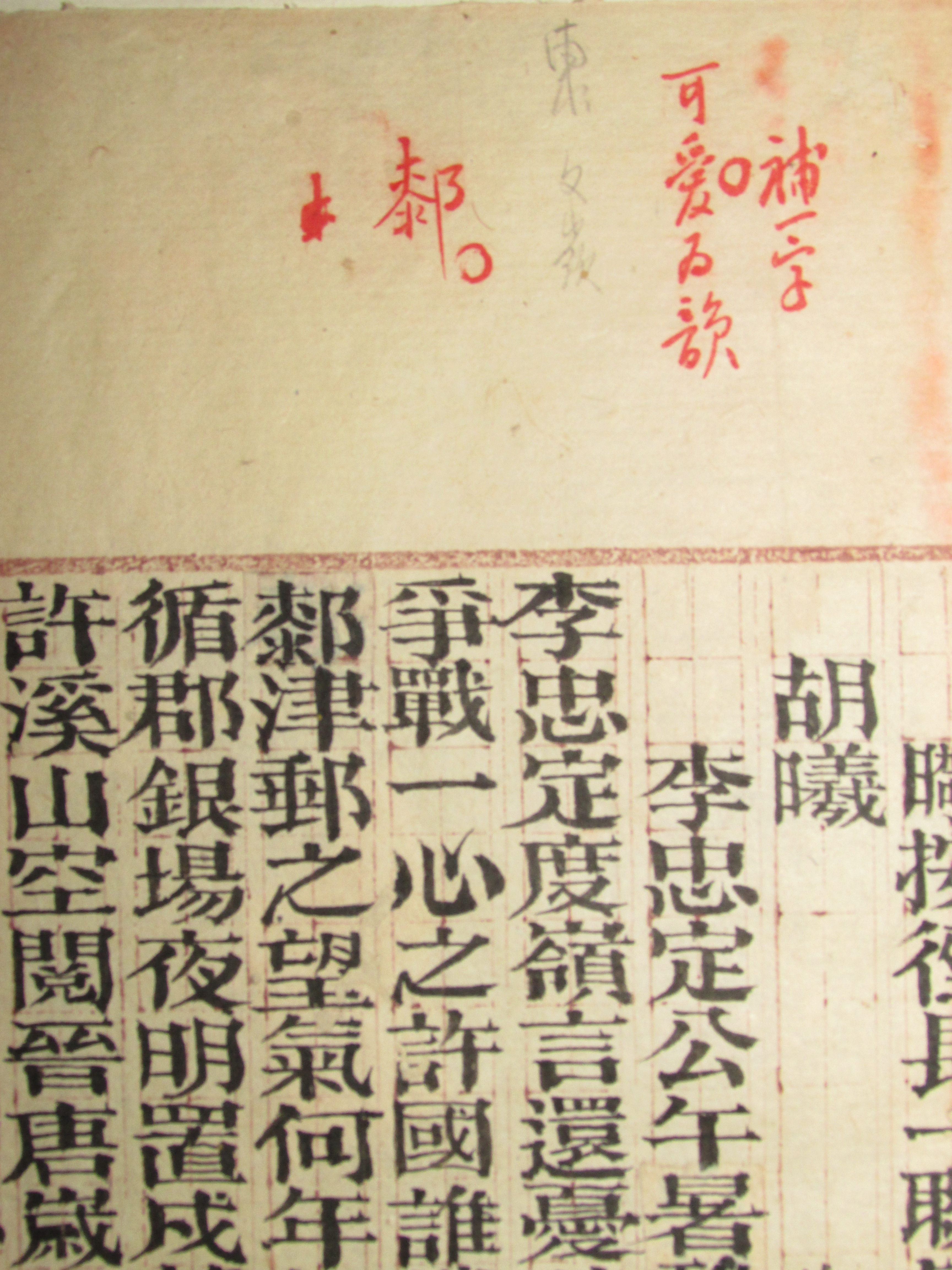 校勘范围包括文章正文、文本格式、文字讹误三大方面,主要有眉批和夹签两种形式。原则上讹脱等文字在误字旁以符号记明,正字更正用眉批或夹批;增删等内容推敲写夹签,贴于正文改动处天头