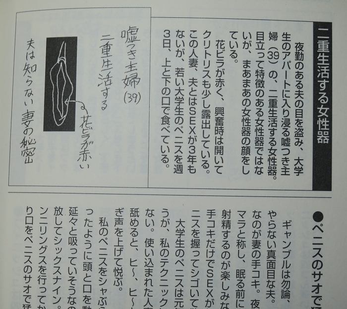 形態・感度・反応、性器の「顔」は花びらで決まる。個性的な性器159選。女性自身の本音も紹介。200個の女性器を統計学的に紹介し、形、花ビラの分析報告をした。イラスト豊富。